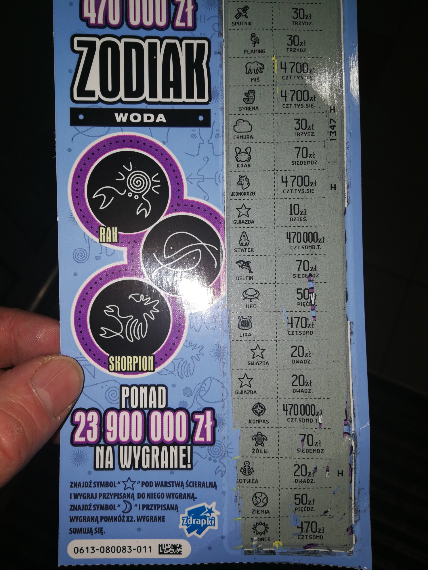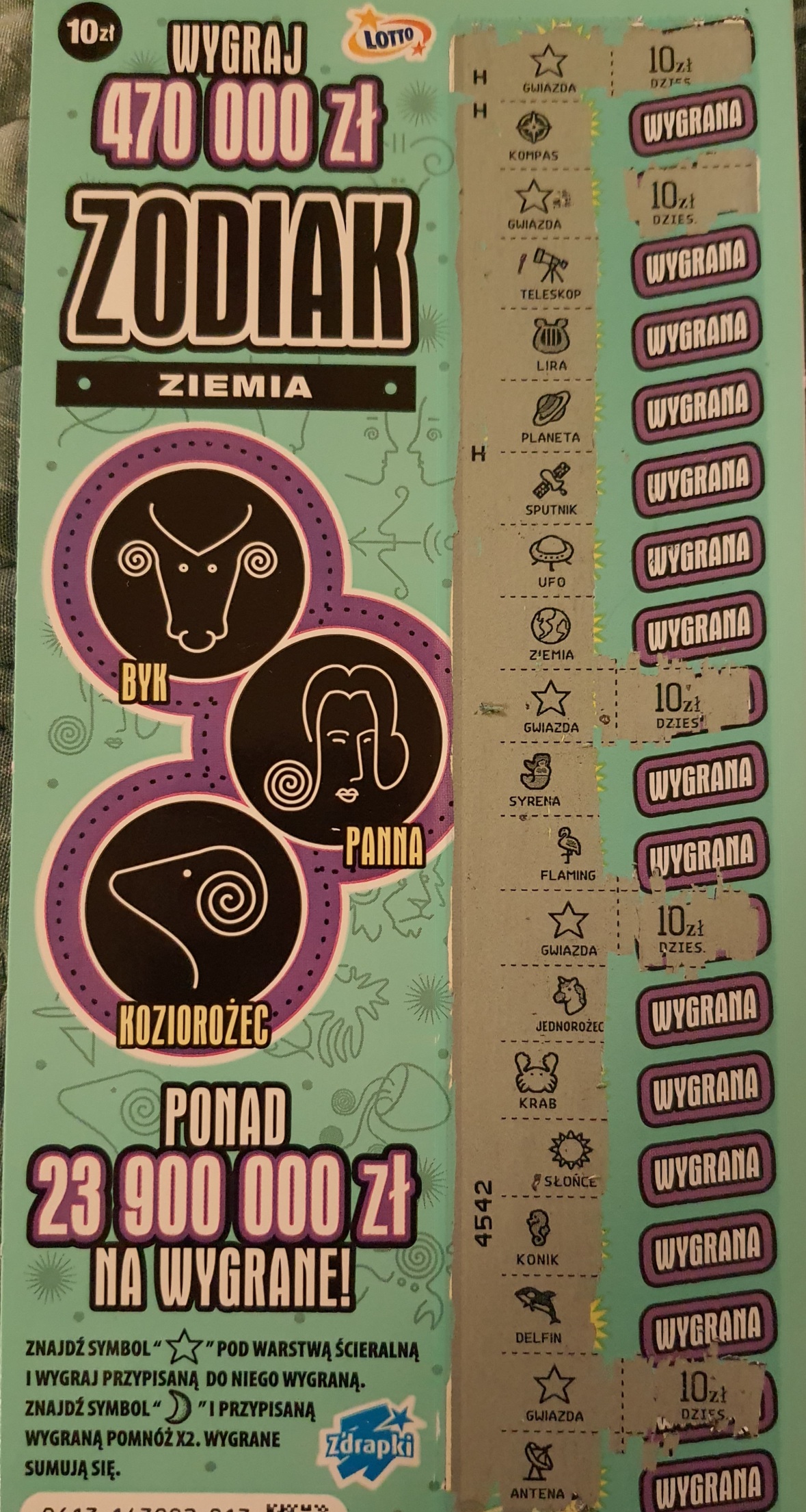 Jedyne usprawiedliwienie to to, że jest to 4 zdrapka jaką kiedykolwiek kupiłem (wszystkie 4 w tym roku i wszystkie 4 to Zodiak).