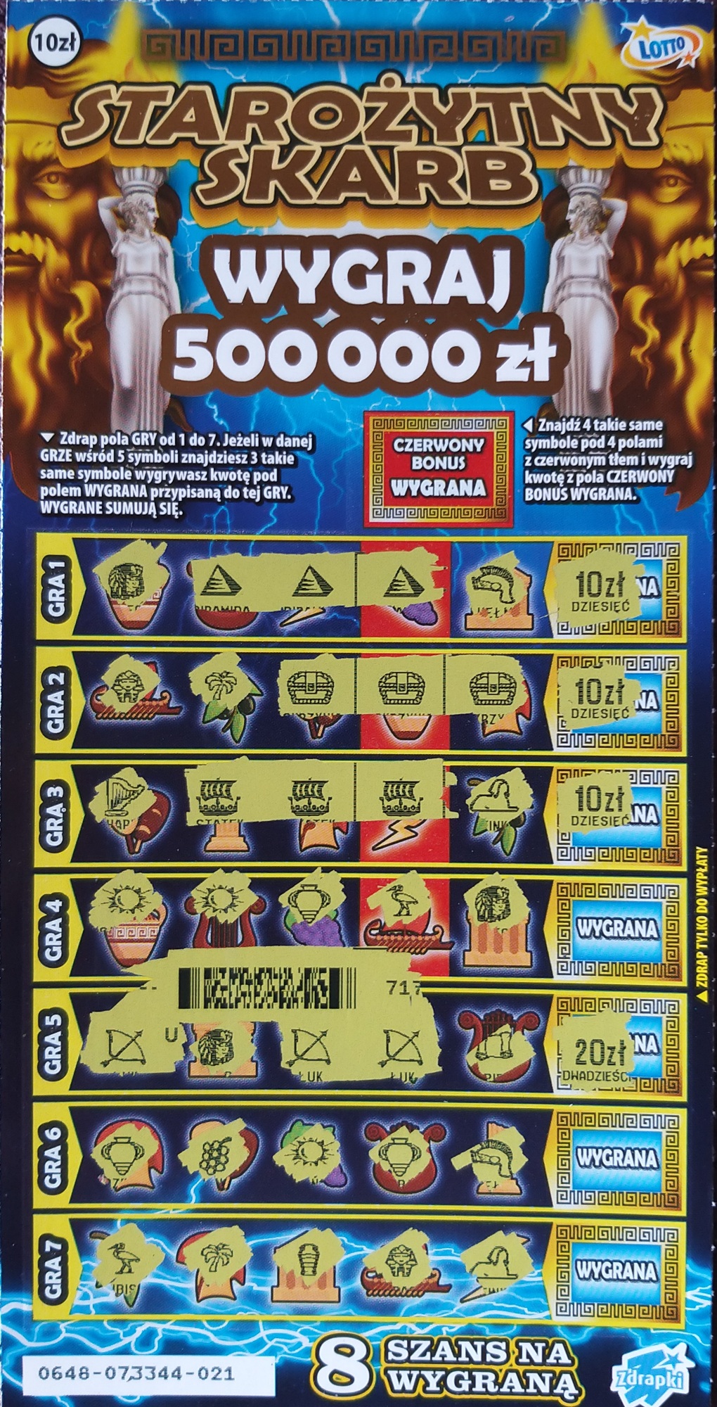 Podoba mi się sama zdrapka, ale póki co nie ustrzeliłam nic ciekawego. 5 sztuk drapniętych, 1x zwrot, 1x 30zl, reszta pusta.