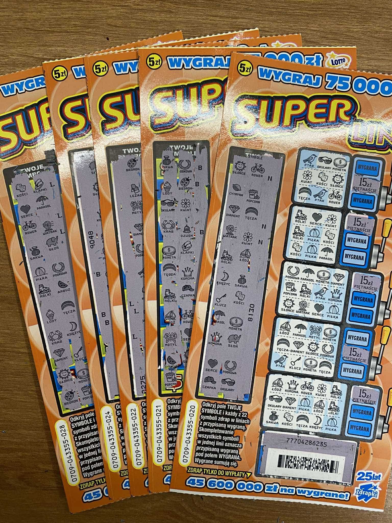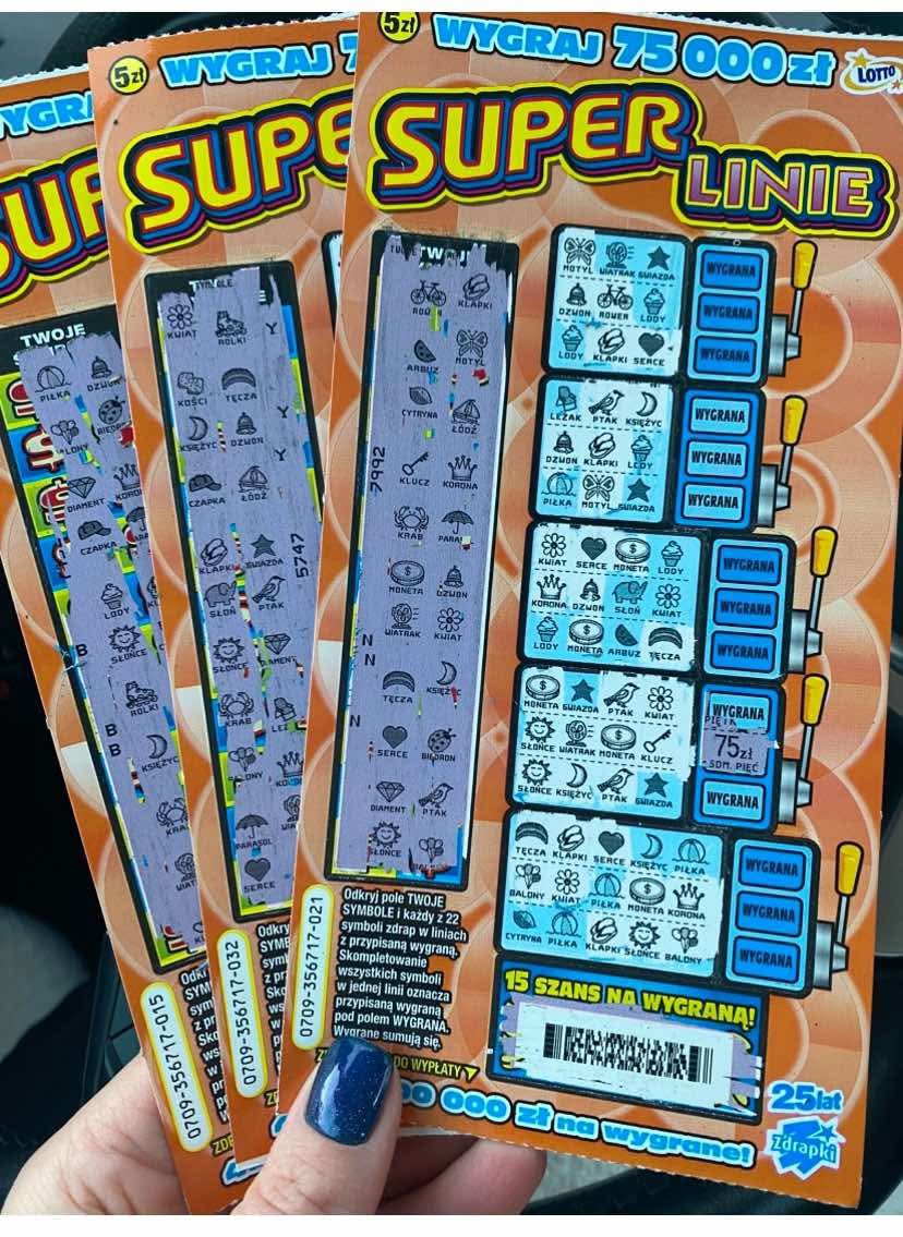 Zakupiłem 2xkrzyżówka(2xpustaki) 3xsuperlinie (2xpustaki i w trzeciej utworzyły się 4 linie- myślałem że pewnie będzie 20zł a tu takie zaskoczenie 75zł pierwszy raz trafiłem w końcu się udało trafić