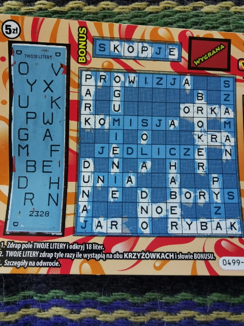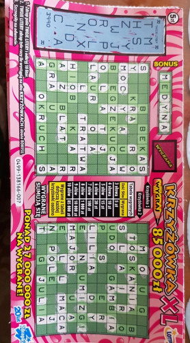 Szczęśliwa niedziela. Do mini wzięłam jedną krzyżówkę i wydrapałam 100 zł. Potem wzięłam 80 zł, a za resztę dwie linie i 2 krzyżówki po 5 zł. W krzyżówkach było 2x5 zł, a w linii 30 zł i jedna pusta.