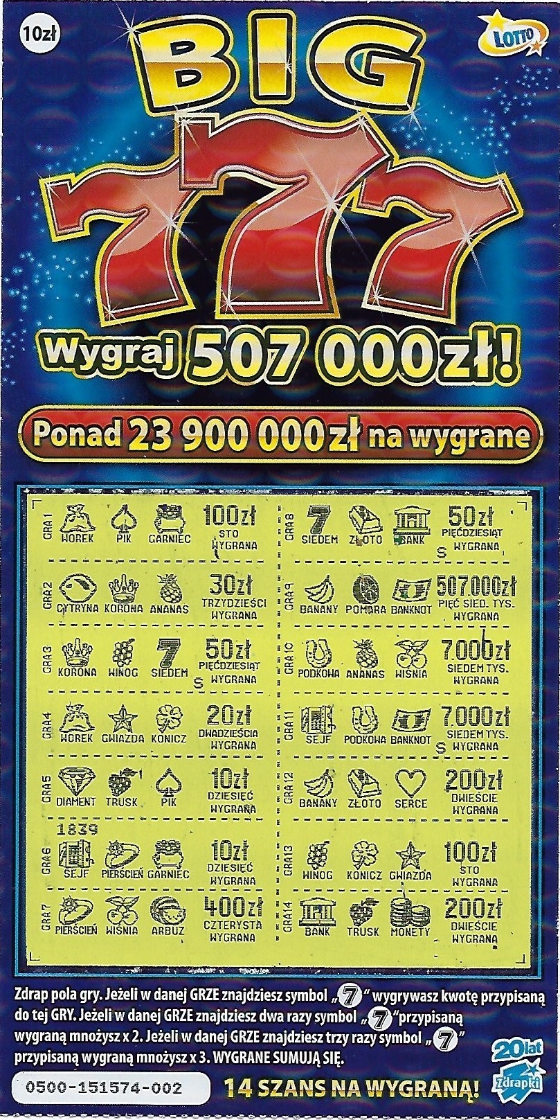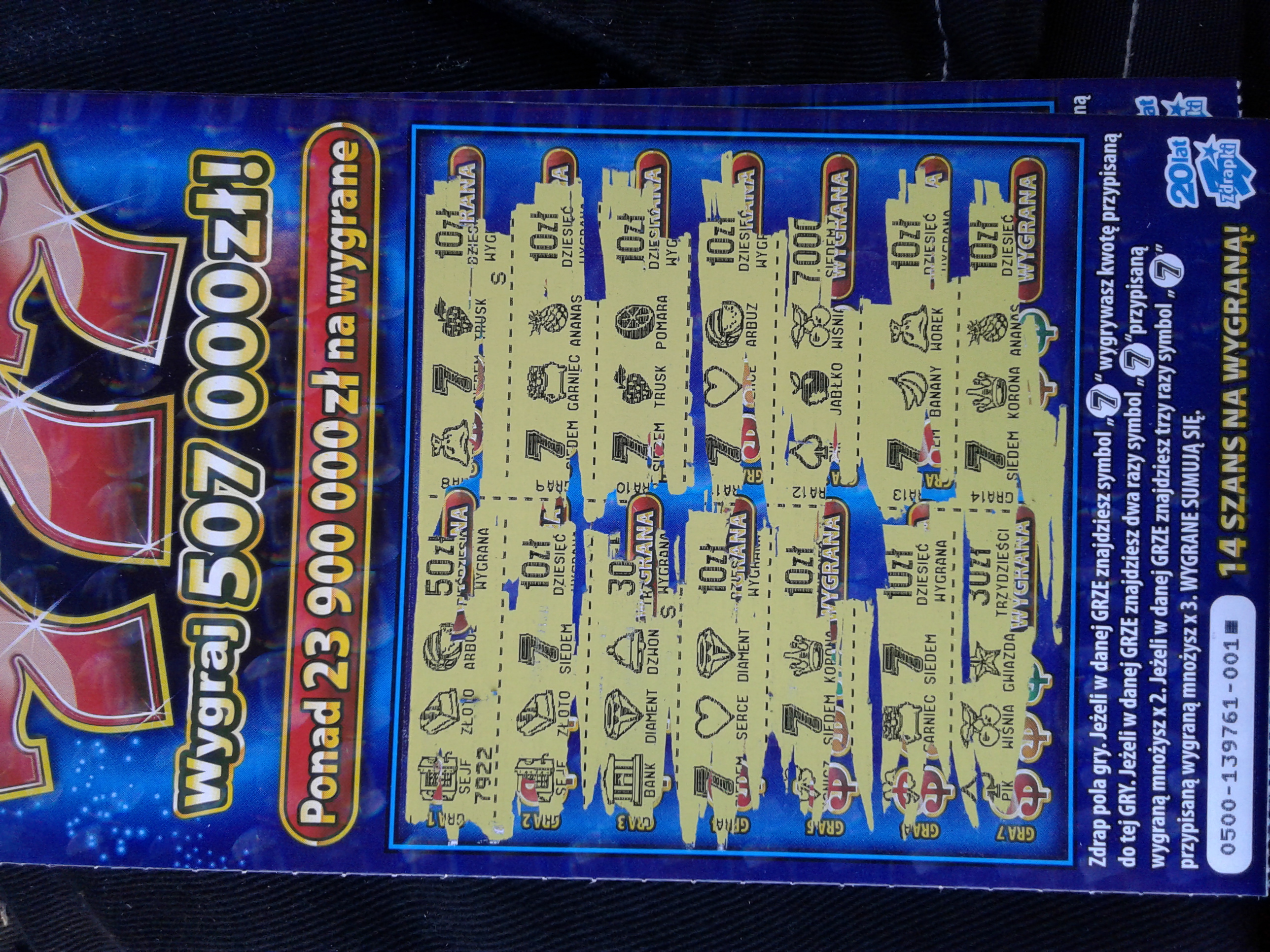 Gratulacje Lotta, ja chyba też źle oceniłem tą zdrapkę, bo pojawiają się coraz wyższe wygrane. Ja dzisiaj zrobiłem polowanie na nią i udało mi się zdobyć właśnie nr. 001 oraz 20 i 21. Jeszcze ich nie zdrapałem, więc nie wiem co tam siedzi.