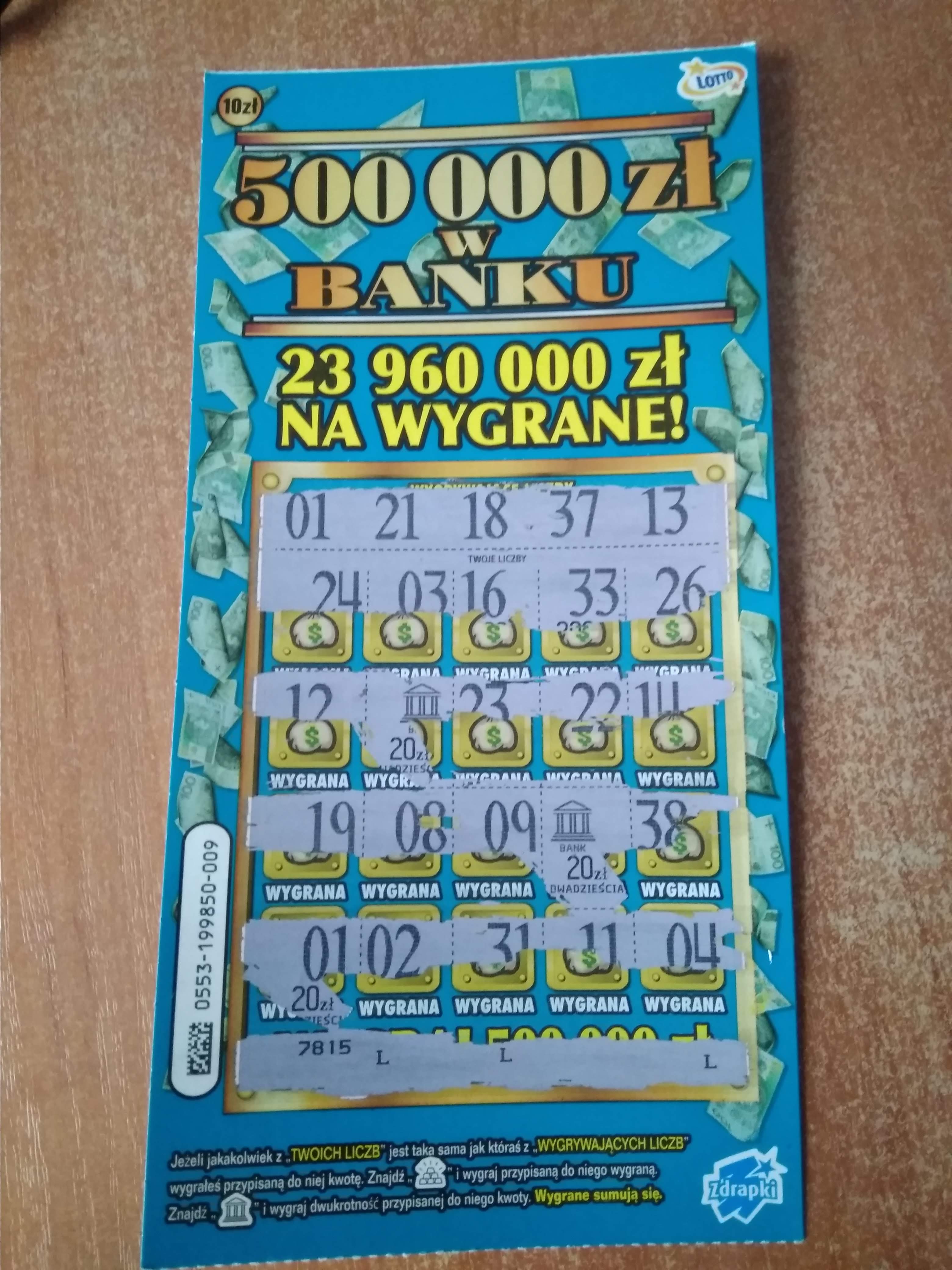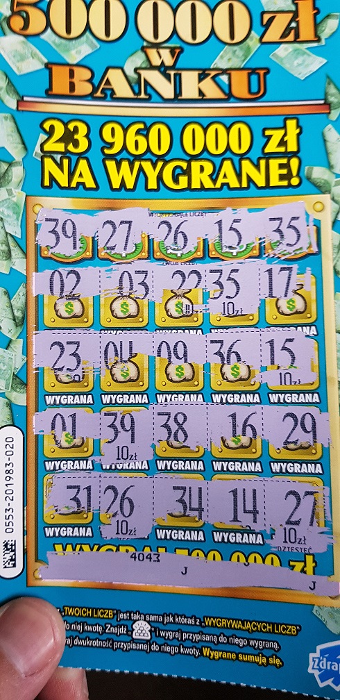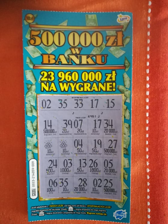 Pięć dyszek mnie cieszy ! Wzięta jedna szt. w spożywczaku, dorzuciłem 2 zł do 8 zł jakie latały po portfelu w postaci drobnych zdrapek. Cieszy, bo miałem takie 3-4 dni na przestrzeni lata że robiłem mini mixy - w pip zdrapek między 30 a 100 zł, i zawsze kończy się to rozczarowaniem, nastawieniem i szukaniem. No i po raz kolejny - najwięcej trafień mam przy `1-2 szt. przy zakupach i w punktach przy okazji, a nie w kolekturach.