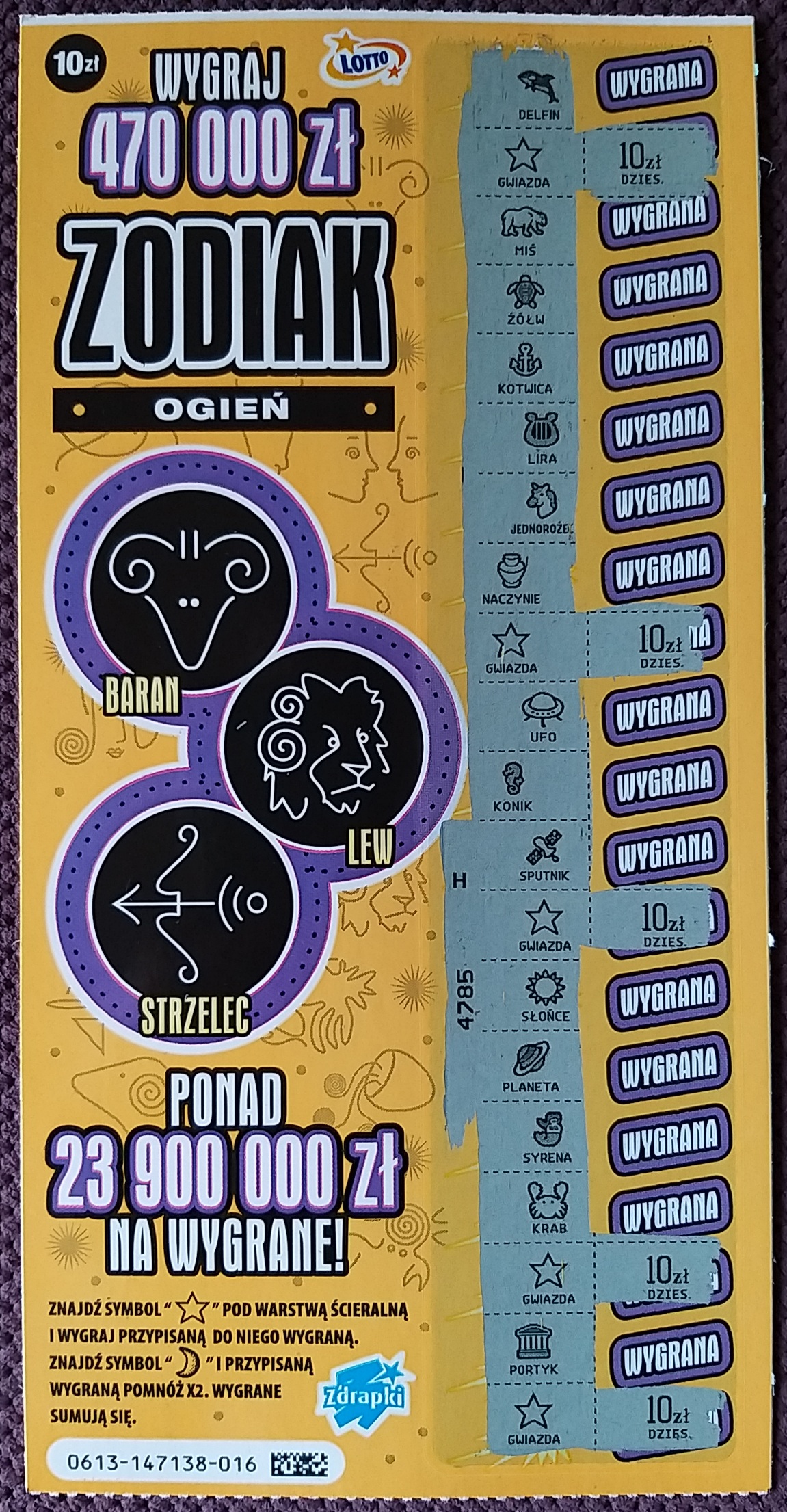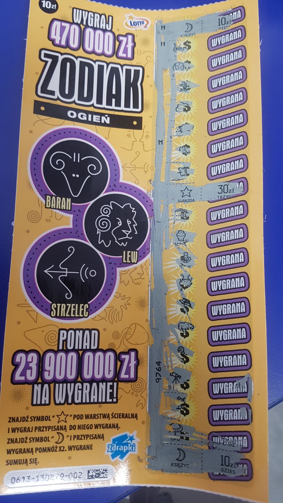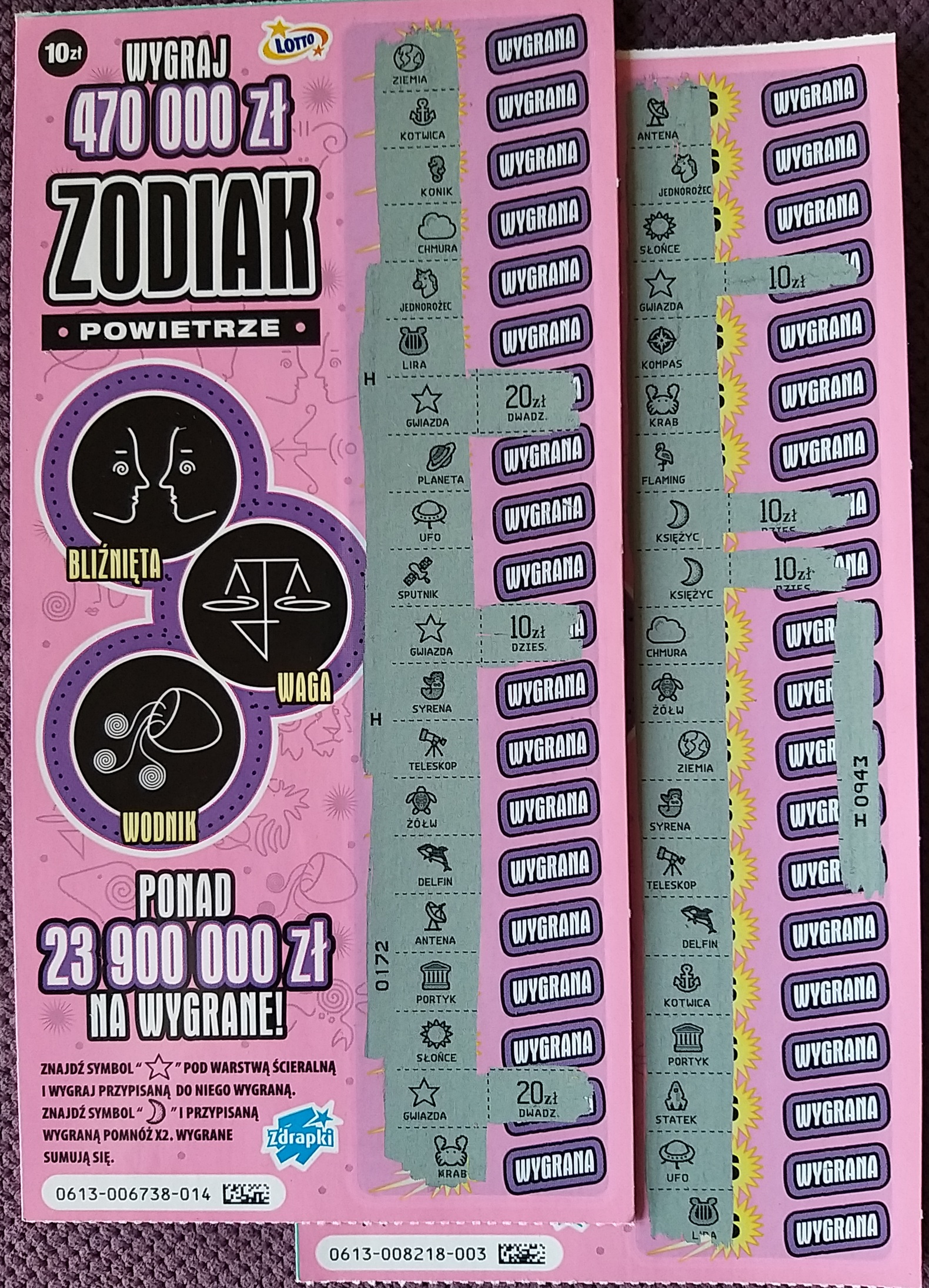 A wziąłem sobie dwie zdrapki jedna z moim znakiem, druga z żony. U mnie pusto, u niej 30zl.