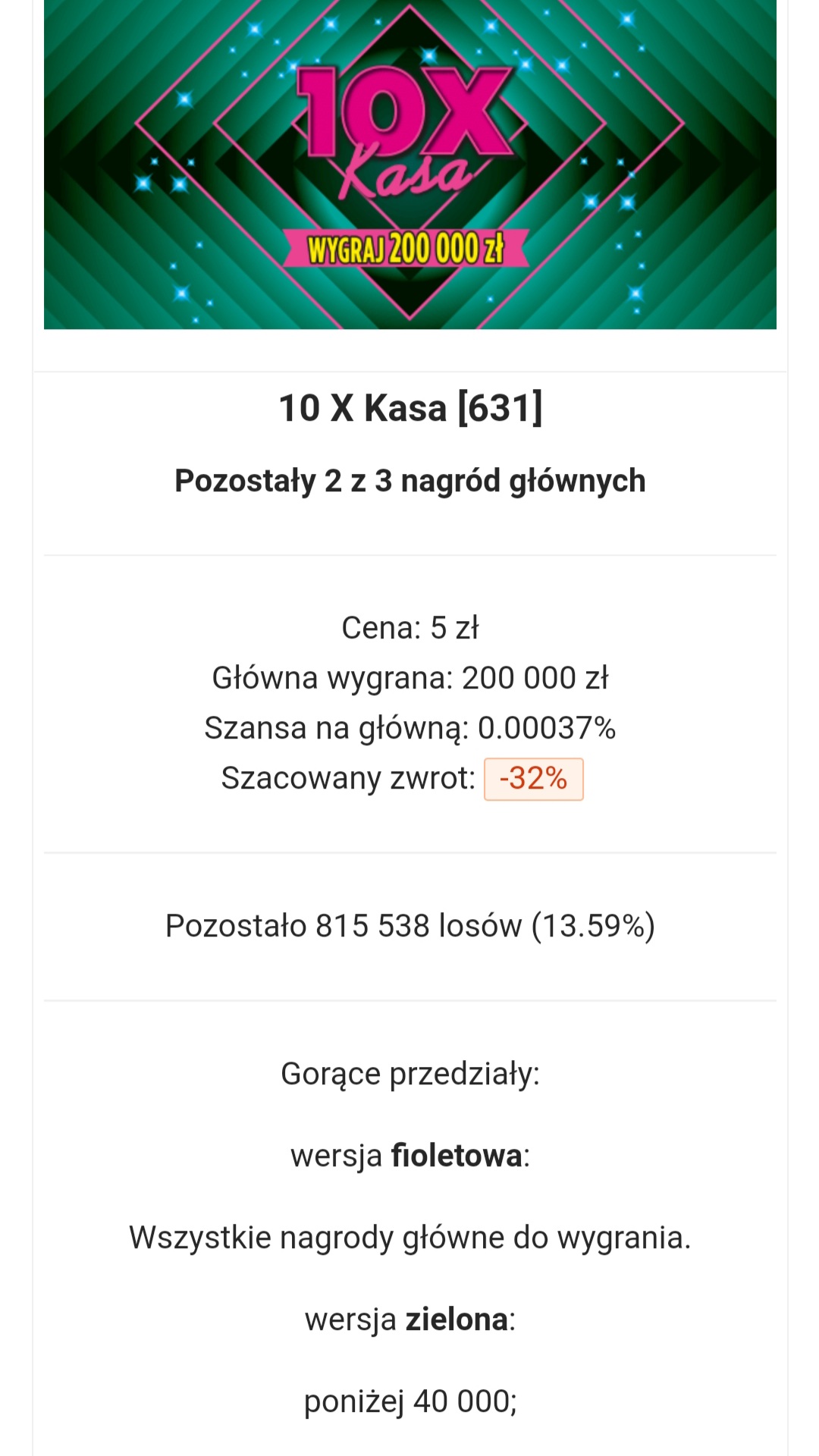 Są trzy transze tej zdrapki: dwie w kolorze zielonym, jedna w kolorze fioletowym. Tak jak jest napisane, główne zostały w pierwszej transzy zielonej (poniżej 40 000) oraz w jedynej transzy fioletowej.sk8erboy26 pisze: ↑28 lis 2022, 20:02Nie wiem jak to rozumieć, bo wynika że w fioletowej chyba że się mylę hmmm