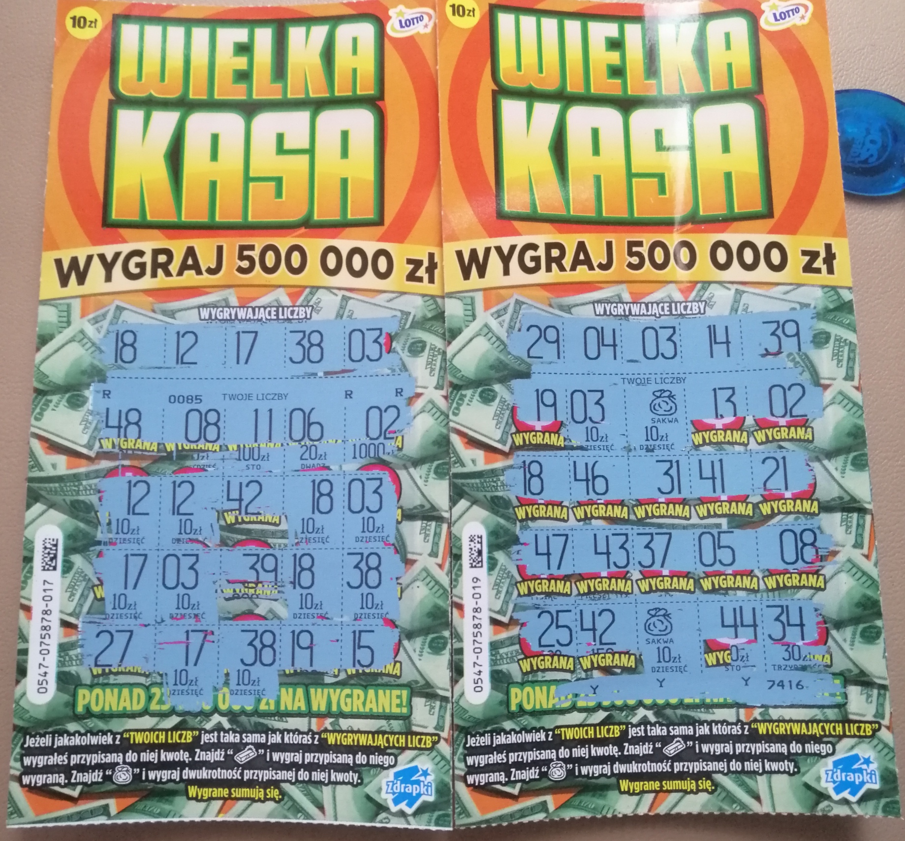 Witam. Dzisiaj premiera a ja jak zawsze na starcie cztery sztuki, tym razem zakup podzielony na dwa razy. Z jednej kolektury wzięte dwie sztuki, numer 25 - pusty, numer 2 - 50zł. Popołudniu kolejne 2 sztuki dokupię z ulubionej kolektury i wtedy zdecyduję czy gramy dalej ponieważ co już wiele razy mówiłem mam tak, ze jeśli premiera udana to później zdrapka wchodzi. Warstwa do drapania rewelacja, łatwo i przyjemnie. Na razie na plus: wydane 20zł, wygrana 50zł, bilans +30zł.