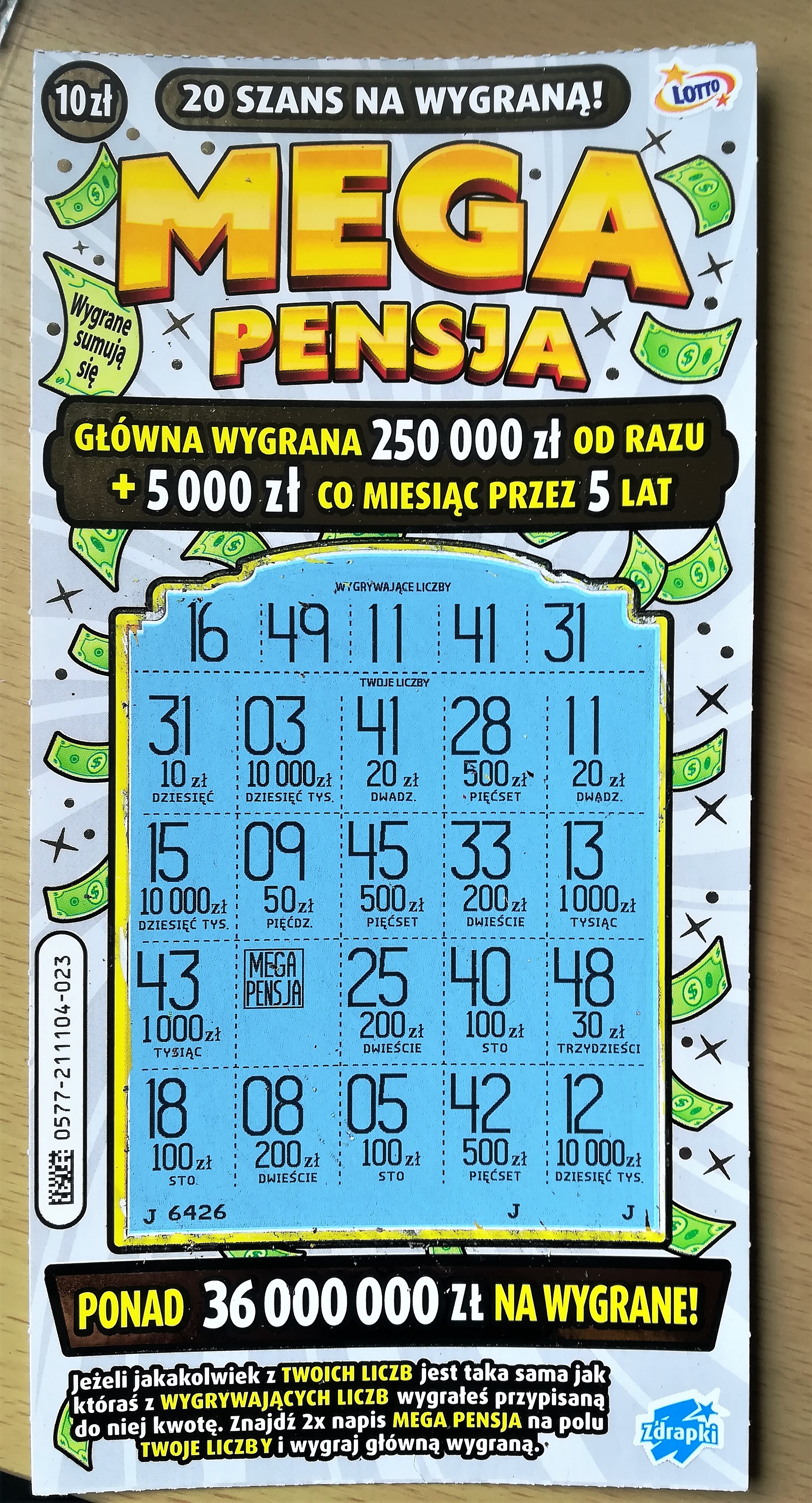 Zakupu MP sobie nie odpuszczę, no ale kurcze żeby w końcu chociaż wpadło głupie 50 czy 100 złotych. Przez wszystkie edycje miałem dosłownie raz 30 i 20 i kilka zwrotów. Gdybym trafił coś większego to pewnie mój stosunek do tej zdrapki o wiele by się polepszył. Zobaczymy jaki kolor jutro spotkam, ale i tak jestem fanem granatowej, zielonej i fioletowej z pierwszej edycji, one miały taki jakiś królewski wydźwięk, czuło się prestiż tej zdrapki.