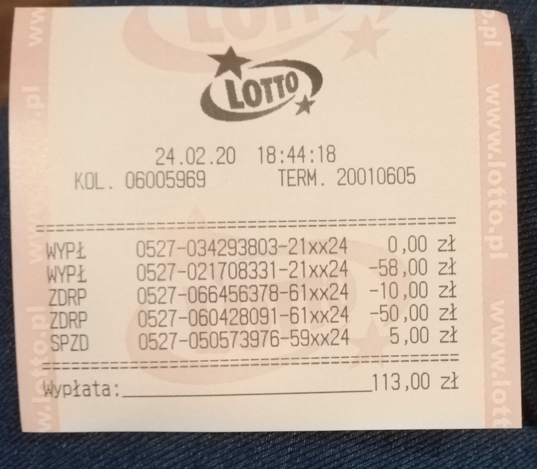 Kupiłam 1 zakład na 10 losowan (20zl), a odebrałam 58zl. Dodaje zdjęcie wypłaty (oprócz tego wypłata ze zdrapek)