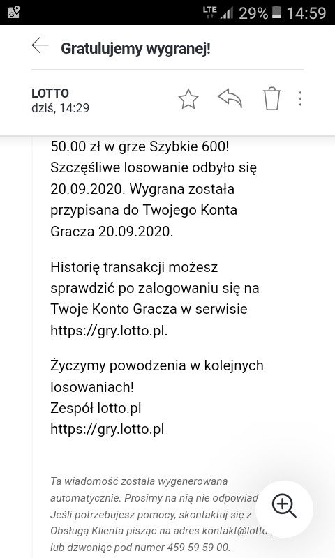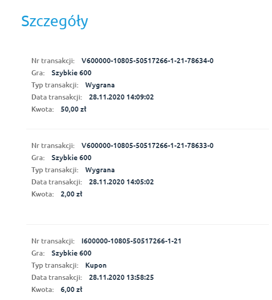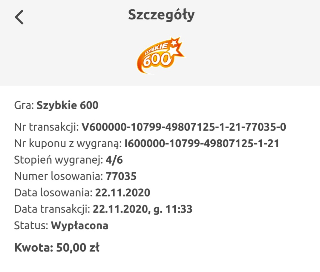 Nie idzie mi w zdrapkach to teraz gram w szybkie 600 i kolejne 50 zł wpadło. W ramach ciekawostki typuję te same liczby co wczoraj (też 50 zł wpadło) i nawet godziny wygranych zbliżone