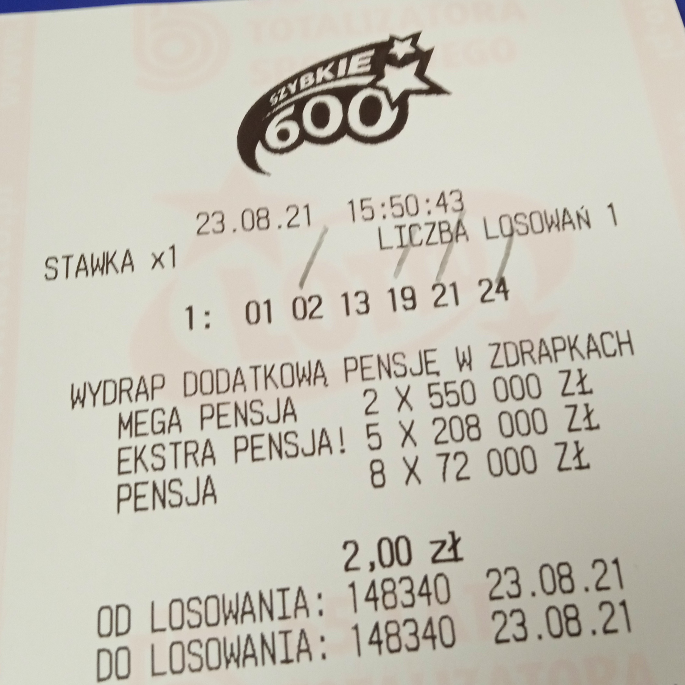 Wczoraj odbierając wygraną z soboty lub niedzieli dostałem premię. 2,70 do dwójki