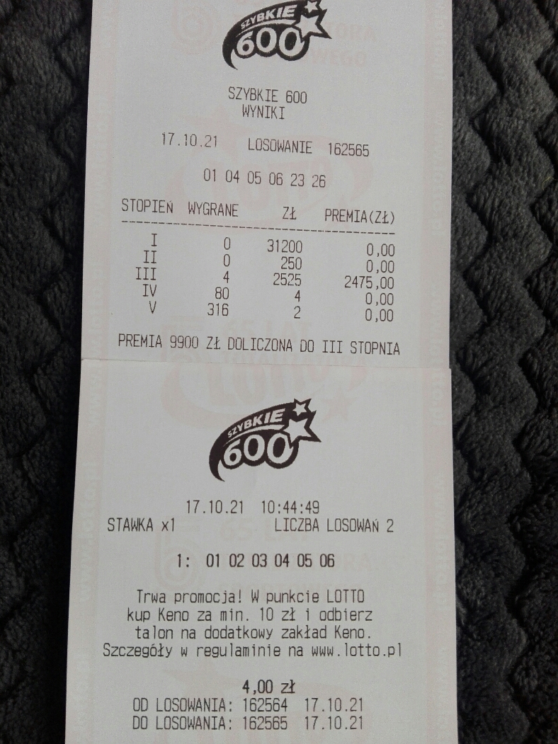 W piątek udało mi się wygrać 50 zł 4/6 na własne liczby.