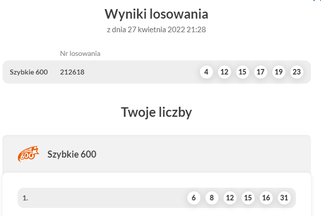 No więc jak w niedzielę wszedłem do żb, przedemną stała klientka, co dyktowała kolektorce linię 1-6 do keno i szy600; zapłaciła i wyszła. Ja kupiłem losy, keno i czekając na los., na monitorze dostrzegłem podaną wysoką premię do szy600. I zdecydowałem się zagrać na 2los.właśnie te liczby. Obu losowań nie oglądałem, wygraną sprawdzłem w domu.