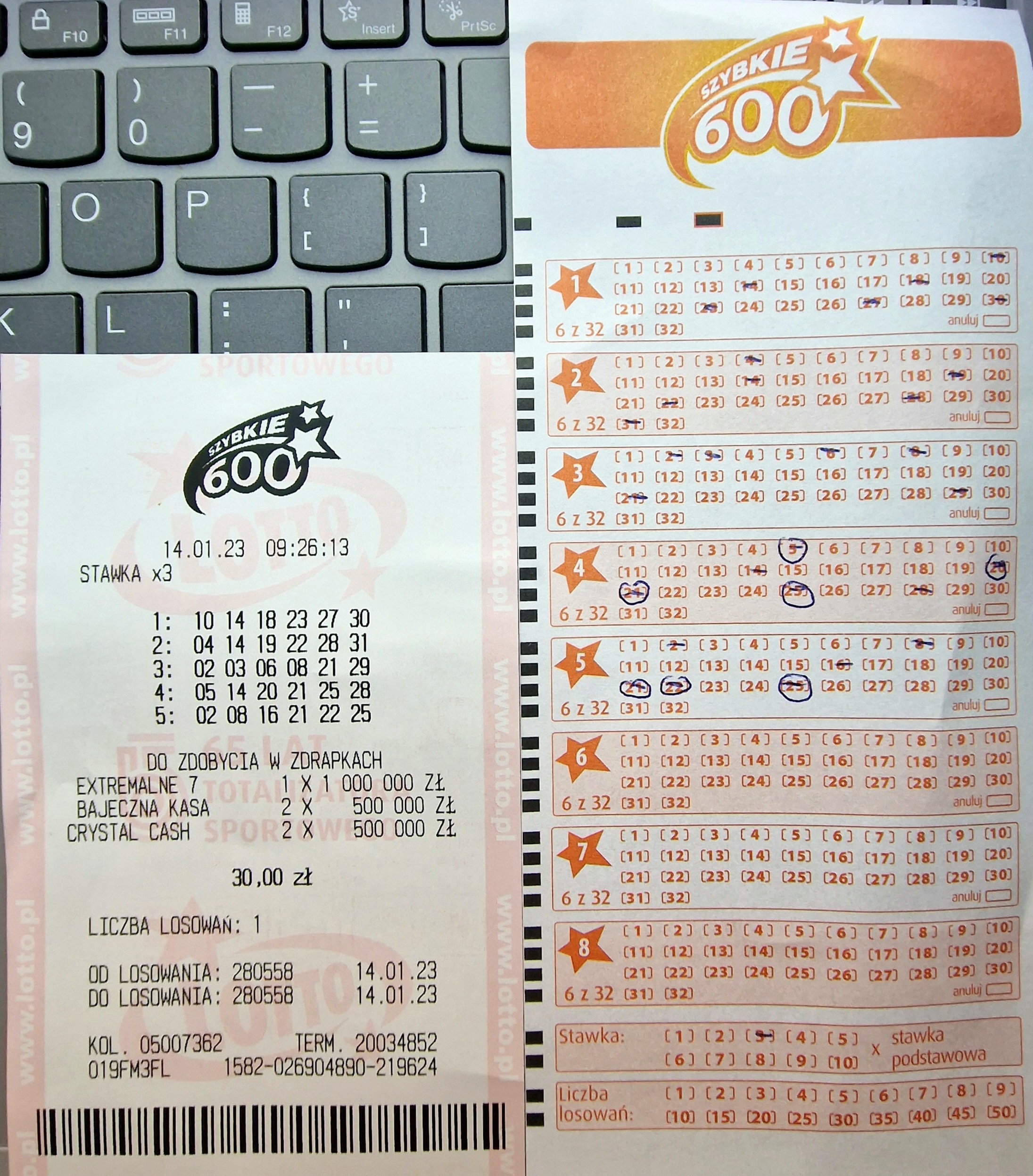 Godzina jak godzina, ale ktoś miał nosa że wysłał minimum na 40 losowań. Dowcip polega na tym, że wczoraj TS poległ na całej linii, ok 19:30 padło online jak i wszystkie kolektury.
