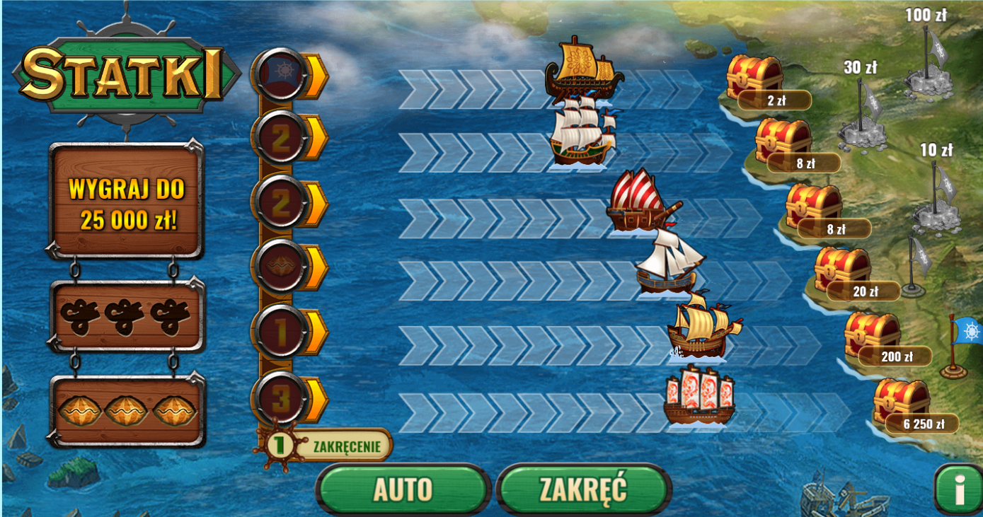 2. Statki - pchasz statki do brzegu, wieje wiatr i je cofa, wypadają muszelki co pozwalają więcej razy pchać statek. Są też bonusy z flagami i zwiększającymi wartość wygranej.