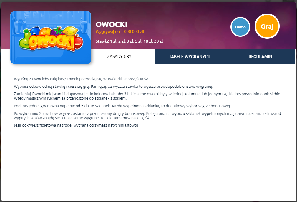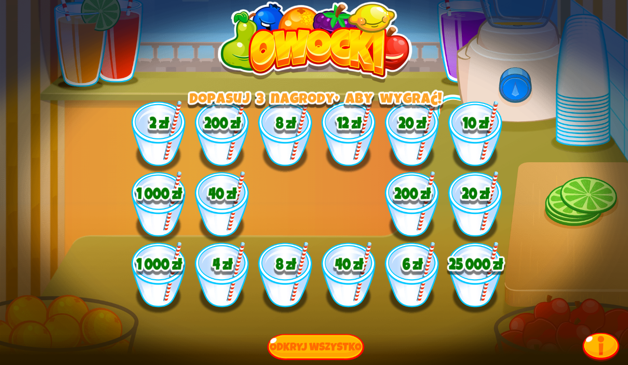 1. Owocki - niezła schiza, takie przekładanie owoców, góra, dół, bok i robienie soków, im więcej zrobisz soków tym więcej kwot losujesz z tych soków i jak masz 3 identyczne to wygrywasz