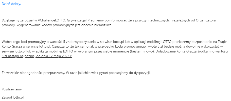 "Doładowanie Konta Gracza nastąpi najpóźniej do dnia 12 maja 2023 r."