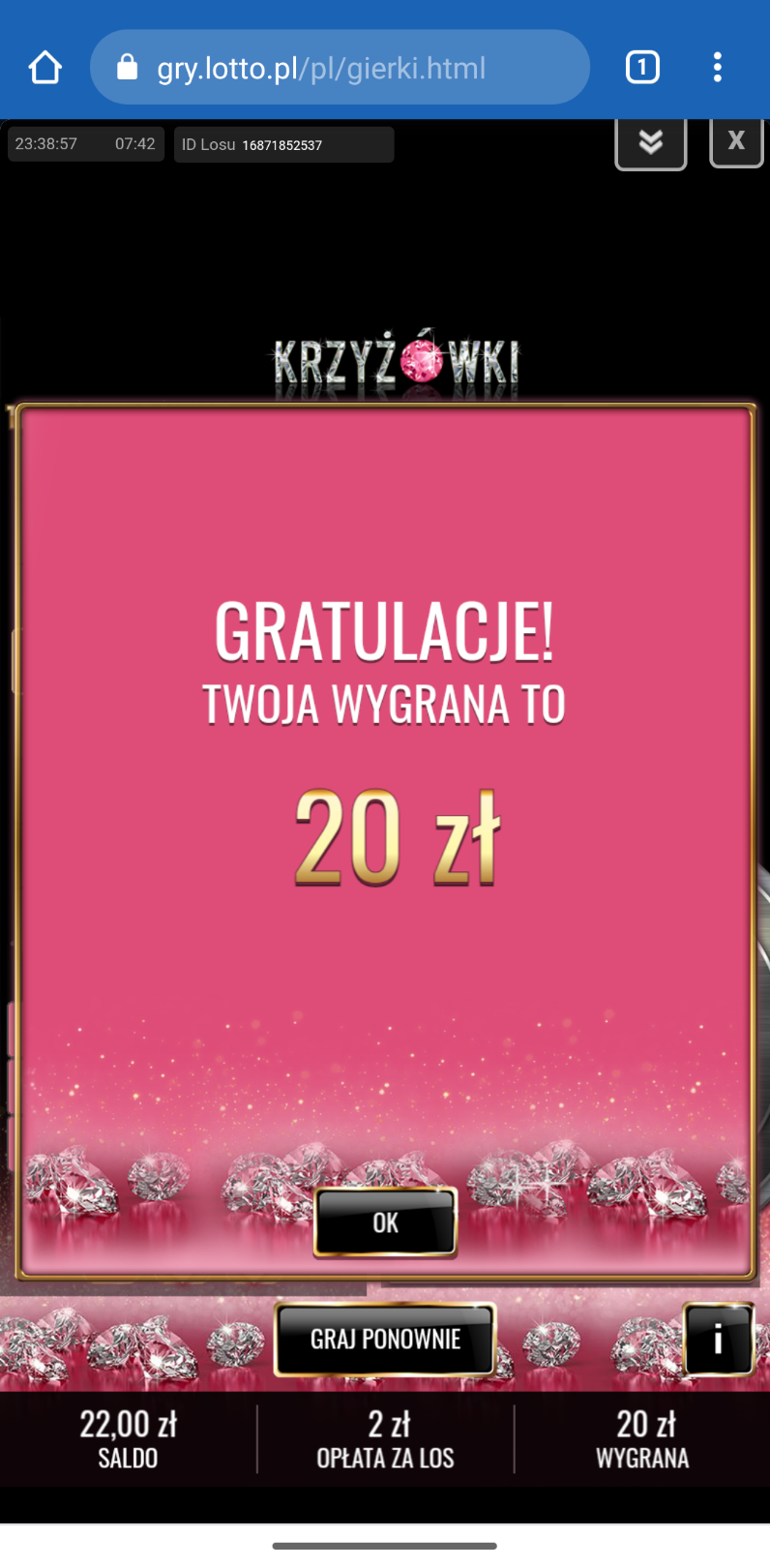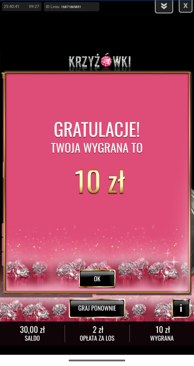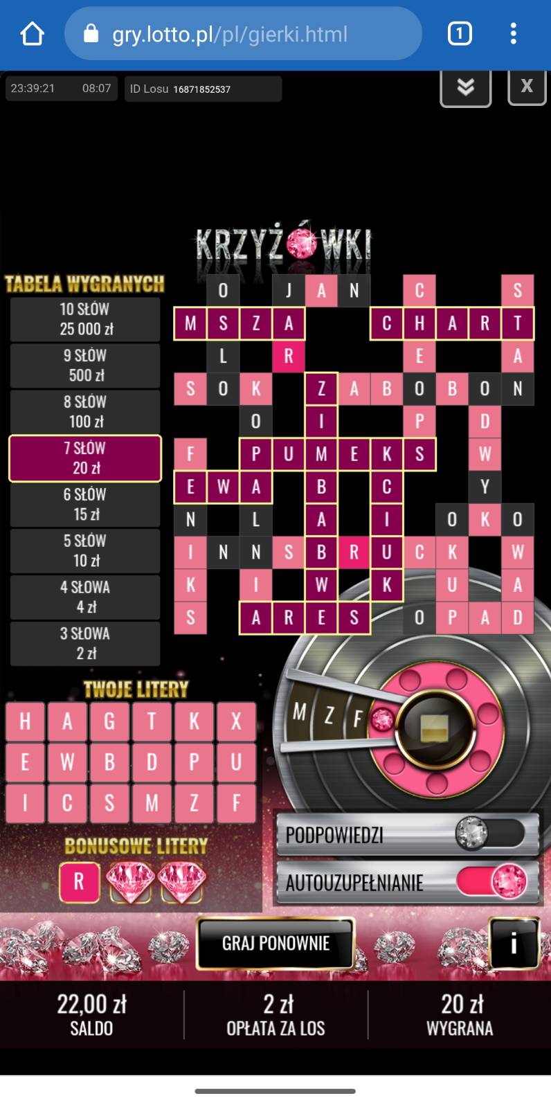 Mając 4 zł zagrałam sobie w krzyżówki za 2 zł w pierwszej padł mój rekord 20 zł tak na prawdę ostatnie litery jak się pokazały to w pewnym momencie myślałam że doleci do stówy ale nici a w drugiej grze wpadło 10 zł.