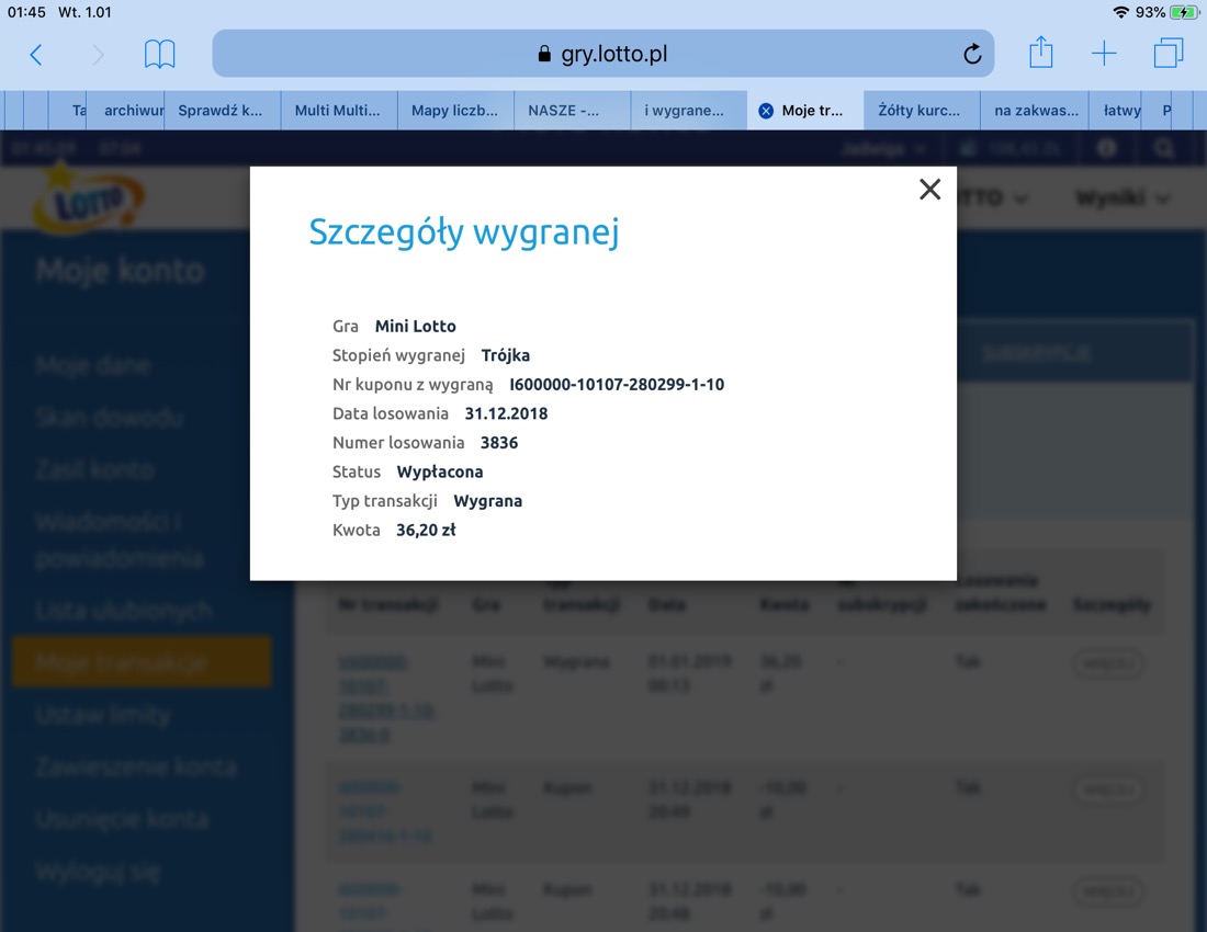 Ponury, będziesz grał dzień w dzień minimum siedmioma zakładami, a pulę zgarnie ktoś, kto kupi jeden lub dwa zakłady Mini za 1,25 zł lub 2,50 zł. Tak to najczęściej jestponury_grabarz pisze: ↑31 gru 2018, 6:35u mnie ostatnie 3 losowania po 30 zakładów i tuzin 2/3 Bilans minioneno tygodnia to jakieś -160 zł , stanowczo za dużo .Dlatego mocne postanowienie iż od tego tygodnia po max 7 zakładów ... Co prawda długo pewnie nie wytrzymam w tym postanowieniu ale choć spróbujeWczoraj 4 wygrane i rekordowa sprzedaż jak na niedziele prawie 928 000 (przeważnie 600-750 tyś ) Gdyby jedna osoba trafiła miała by 232 tyś zł zazwyczaj było max 160-170 tyś skok duży ale spory w tym udział końca roku