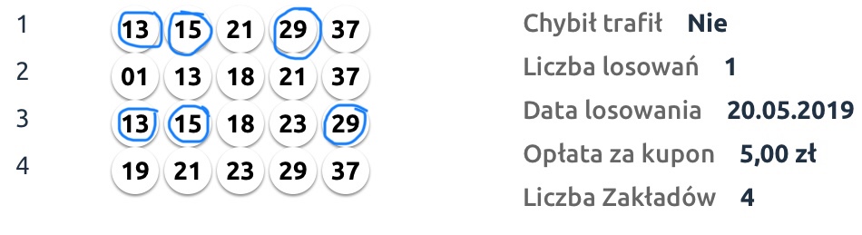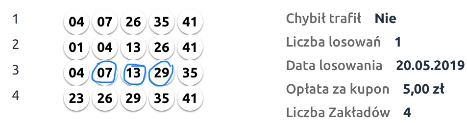 Ja gram codziennie po 10 zakładów na chybił trafił od kwietnia. W kwietniu 2 "3" płatne po niecałe 20 zeta. W maju już 3 "3" 2 słabo płatne i jedna 44,10.