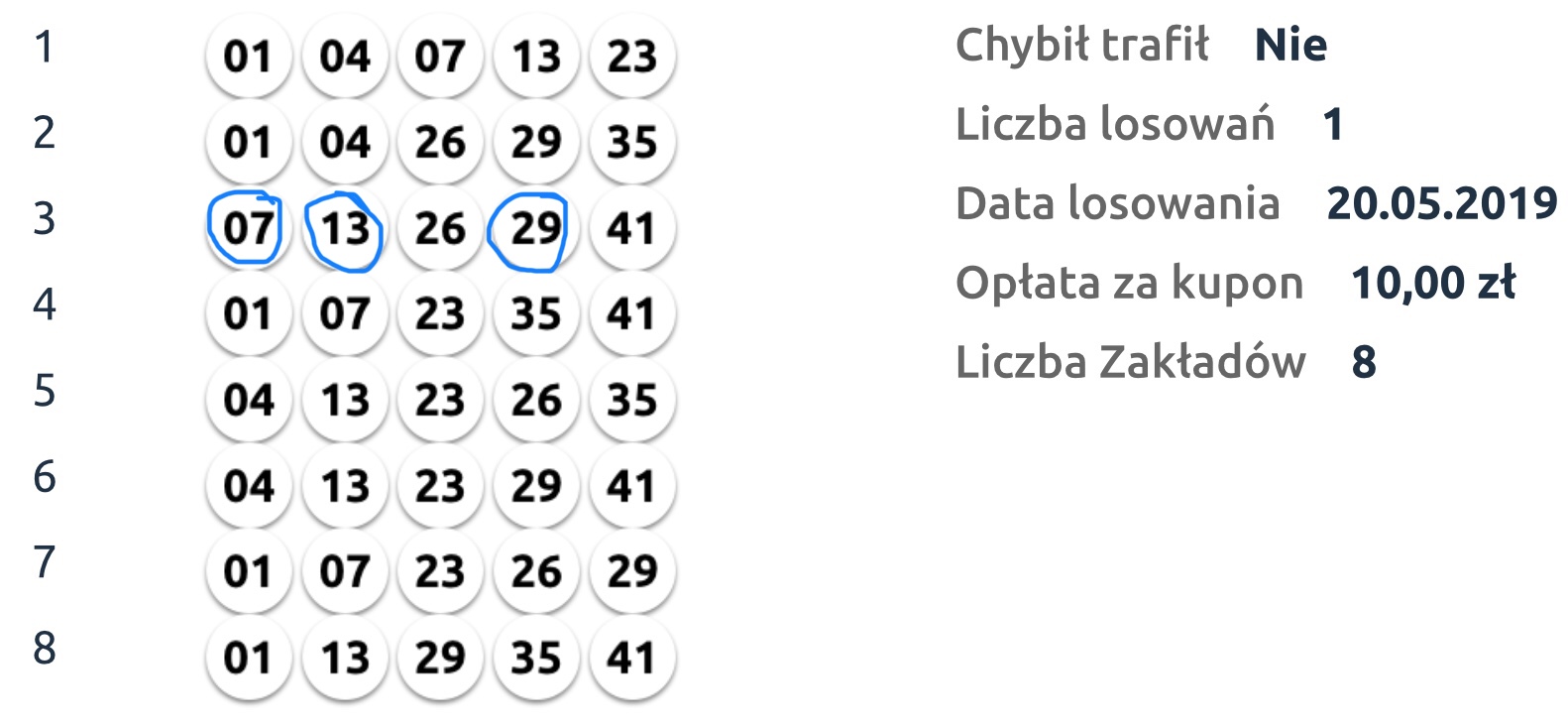 Mam wytypowane 2x po osiem zakładów i gram nimi codziennie. Do tego mam wytypowane 4 zestawy po dziewięć liczb.