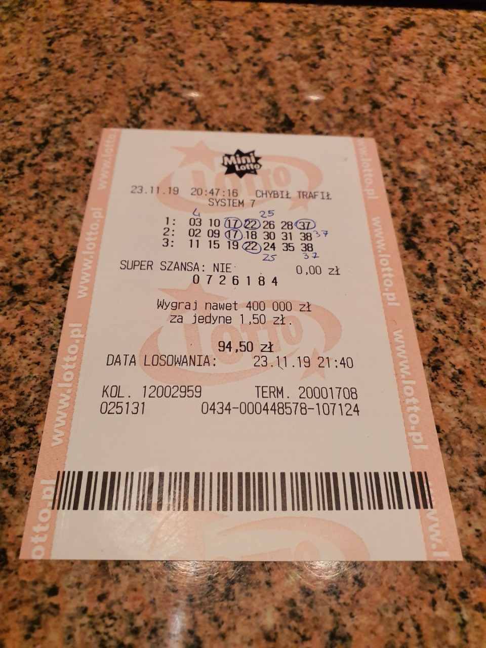 U mnie dzisiaj ponownie trafiona trójka w zakładzie system 7 WT i dodatkowo trójka w zakładzie zwykłym: