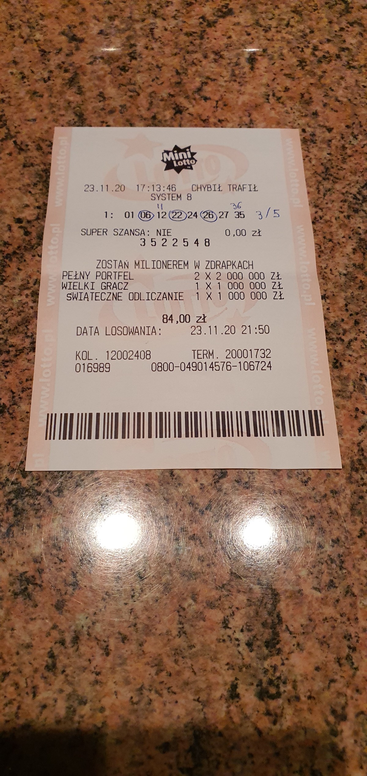 U mnie dziś wpadła druga w tym miesiącu trójka w systemie na 6 skreśleń, też na chybił trafił: