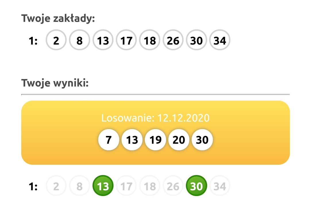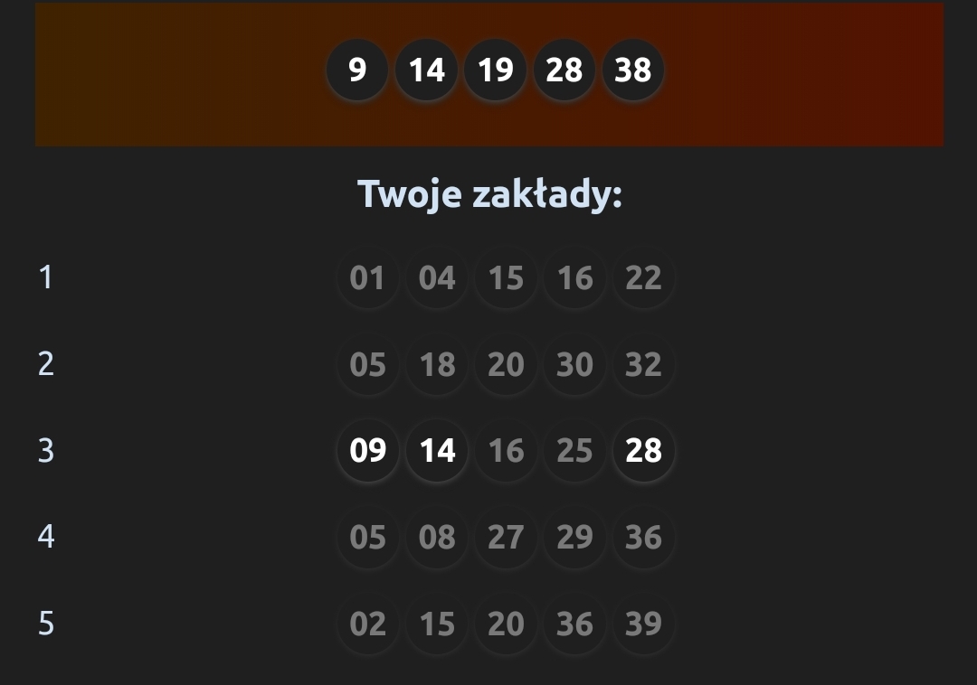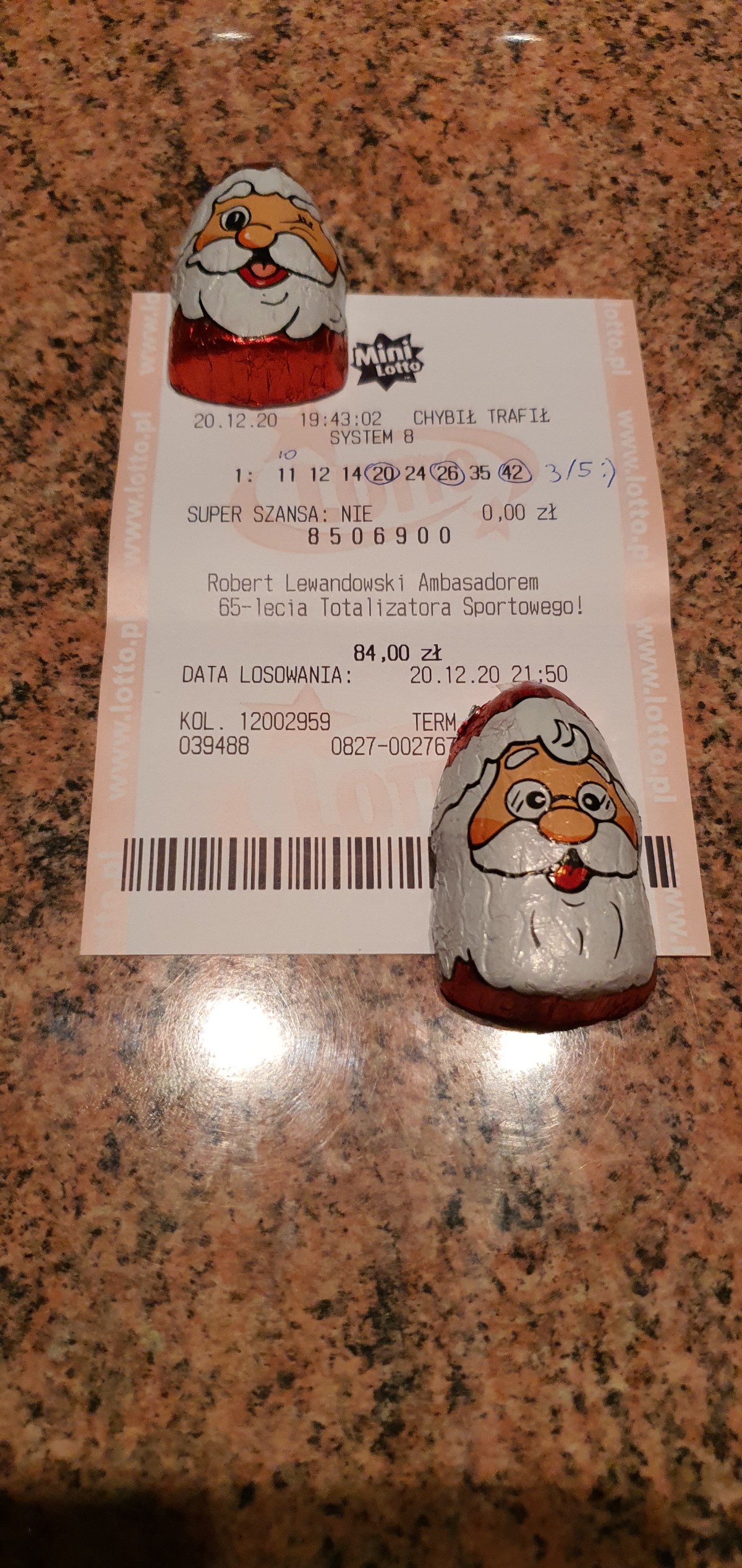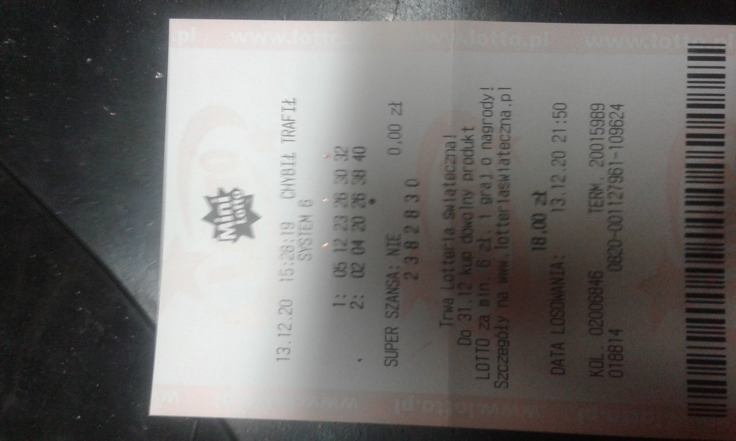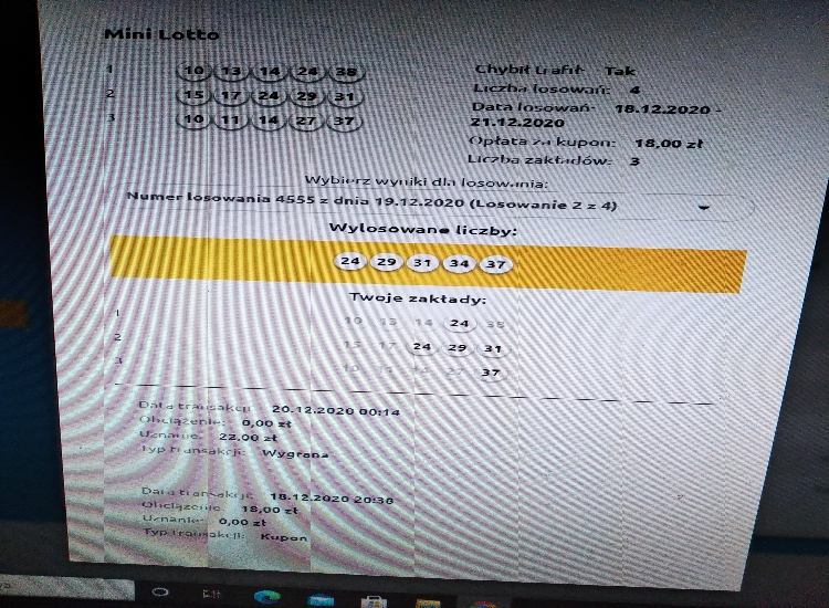 Na razie w miarę szczęście dopisuje. W grudniu 2x4/6 i 1x3/6 w DL i dzisiaj pierwsza 3 w Mini. W niedzielę się zniechęciłem oglądając kupon, gdzie większość liczb różniła się minimalnie od wygrywających. Ale gram dalej