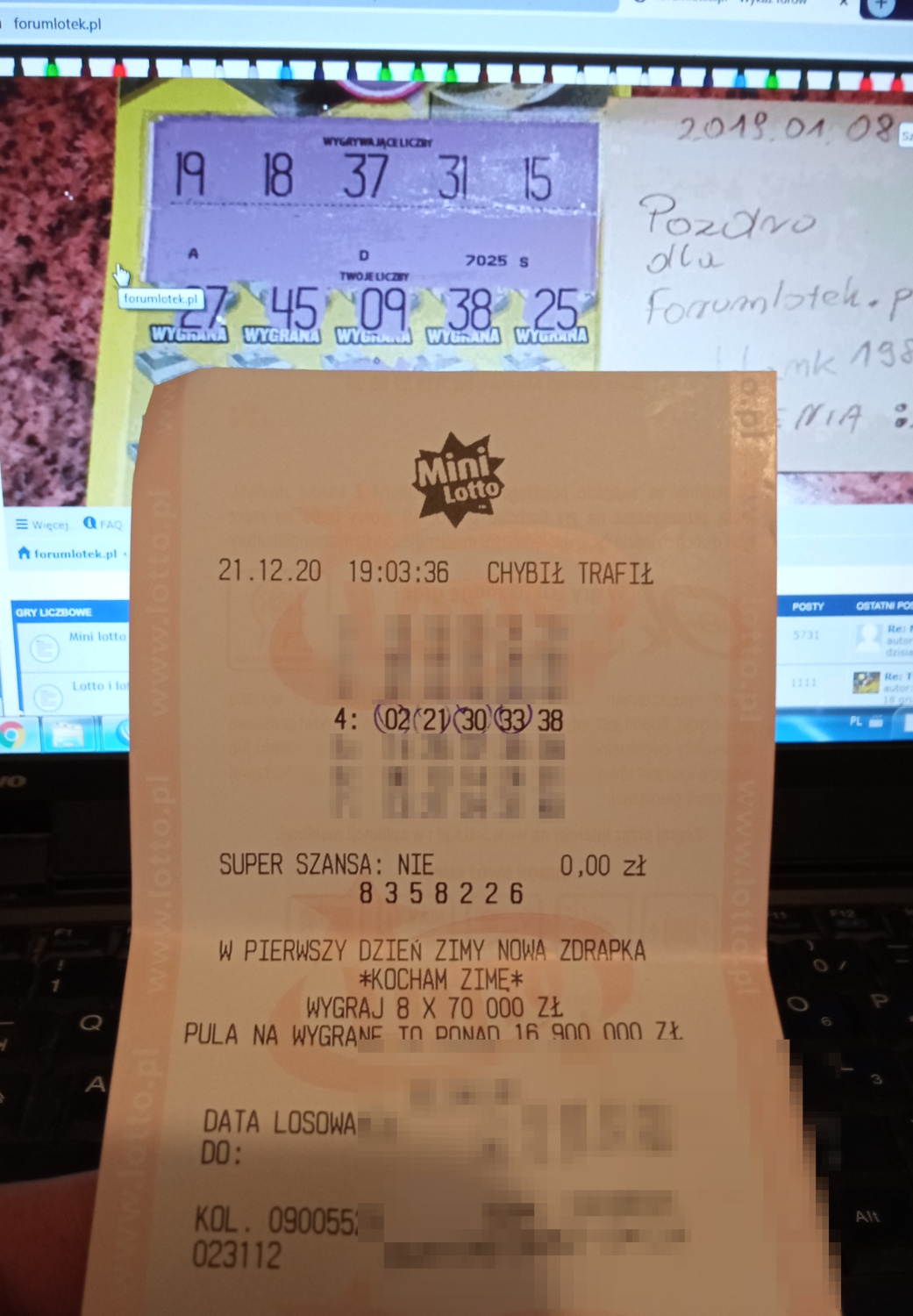 Grałem podobnie szkoda było nerwówKrZySiEk8964 pisze: ↑21 gru 2020, 10:38Ja wysłałem 25 zakładów CT na 10 losowań i przez 2 pierwsze losowania nic, nawet trójki. Mam jeszcze 8 losowań, zobaczymy.
