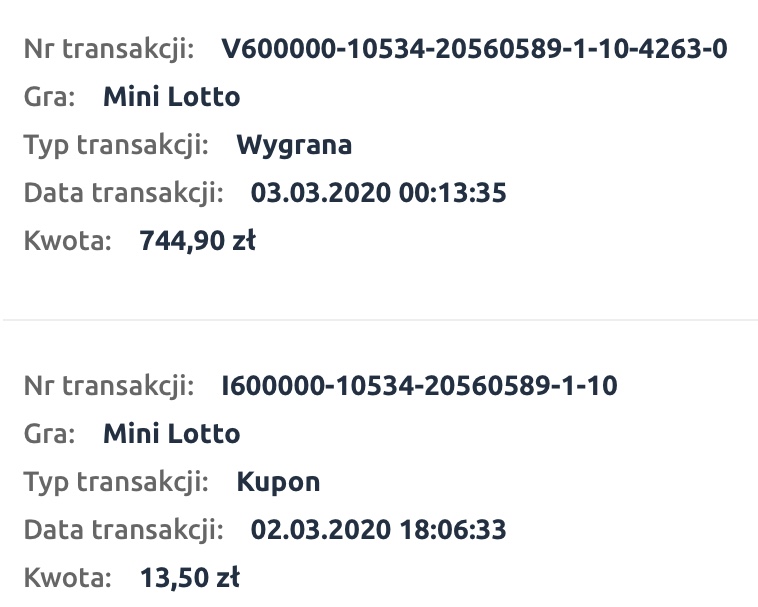 Gratulacje za czwóreczkęRedzi1976 pisze: ↑01 mar 2020, 11:22Moje wczorajsze 4/5 wt w mini. Tym razem zagrane tradycyjnie w mojej kol. Był u mnie gościnnie kolega Tier z forum z którym wysyłaliśmy swoje typy mini i wysłaliśmy wspólnie mm 6 liczb z plusem na dwa losowanie, ale niestety w mm we wspólnej grze nic nie wpadłoMoje 4/5 niestety słabo płatne - 229.70 zł