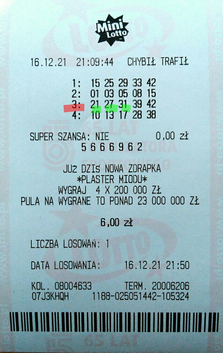 Wysłane 6 zakładów w tym 02,08,20,25,26. A wylosowane zostały liczby 02,08,23,25,26. Cieszę się, bo byłem mentalnie nastawiony na stratę, ale czwórka była blisko. Wprawdzie nie pamiętam, czy miałem zamiar dać liczbę 6, ale pamiętam, że przez moment się zastanawiałem, która liczbę do tej 2 dobrać. Trójka płatna 22 zł.