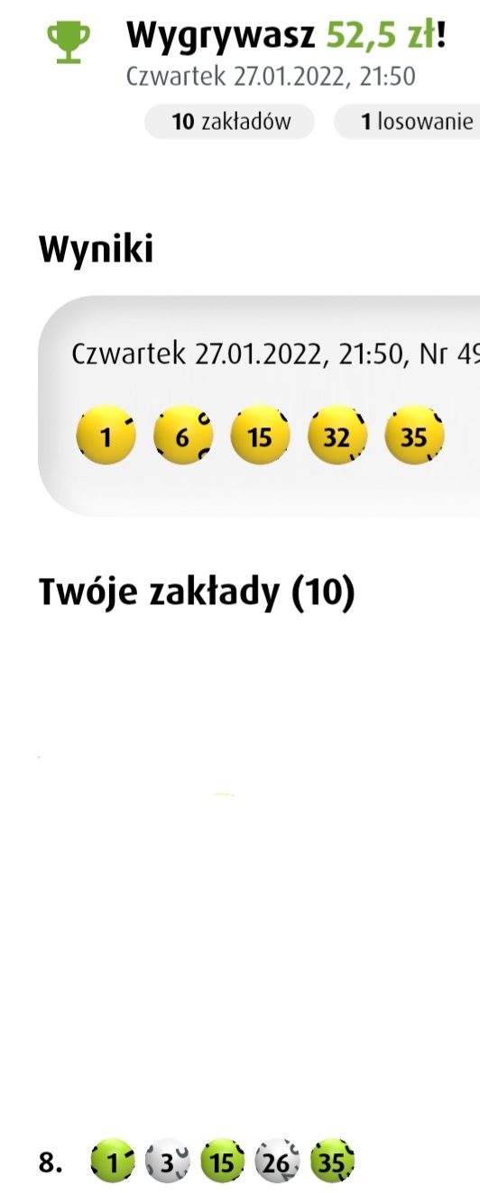 Mini lotto to zdradliwa gra. Miałem czwórki (jedna jest w alejce) , mnóstwo trójek. Ale jak podliczyczylem 2021 rok to duży minusKrZySiEk8964 pisze: ↑30 sty 2022, 15:49Spokojnie, jeszcze mam 4 losowaniaroberthajto pisze: ↑30 sty 2022, 13:53Już czekałem na kolejną czwórkę otwierając ten post.powodzenia w drodze do piątki życzęKrZySiEk8964 pisze: ↑30 sty 2022, 6:57U mnie też weszła trójka na tym kuponie od czwórki za 371,10 zł.