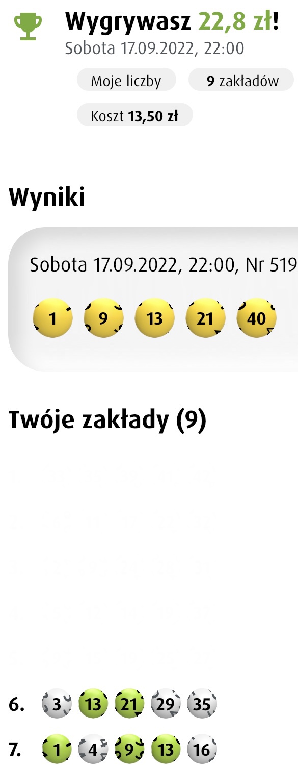 Gratki ! należało Ci sięnewużytkownik pisze: ↑21 wrz 2022, 22:44Pierwsza czwórka w Mini Lotto i jednocześnie najwyższa moja wygrana. Wysłane łącznie 16 zakładów, w ostatnim trafione 4/5 i do tego jeszcze 3/5 wpadło. Czwórka płatna 495,10 zł![]()