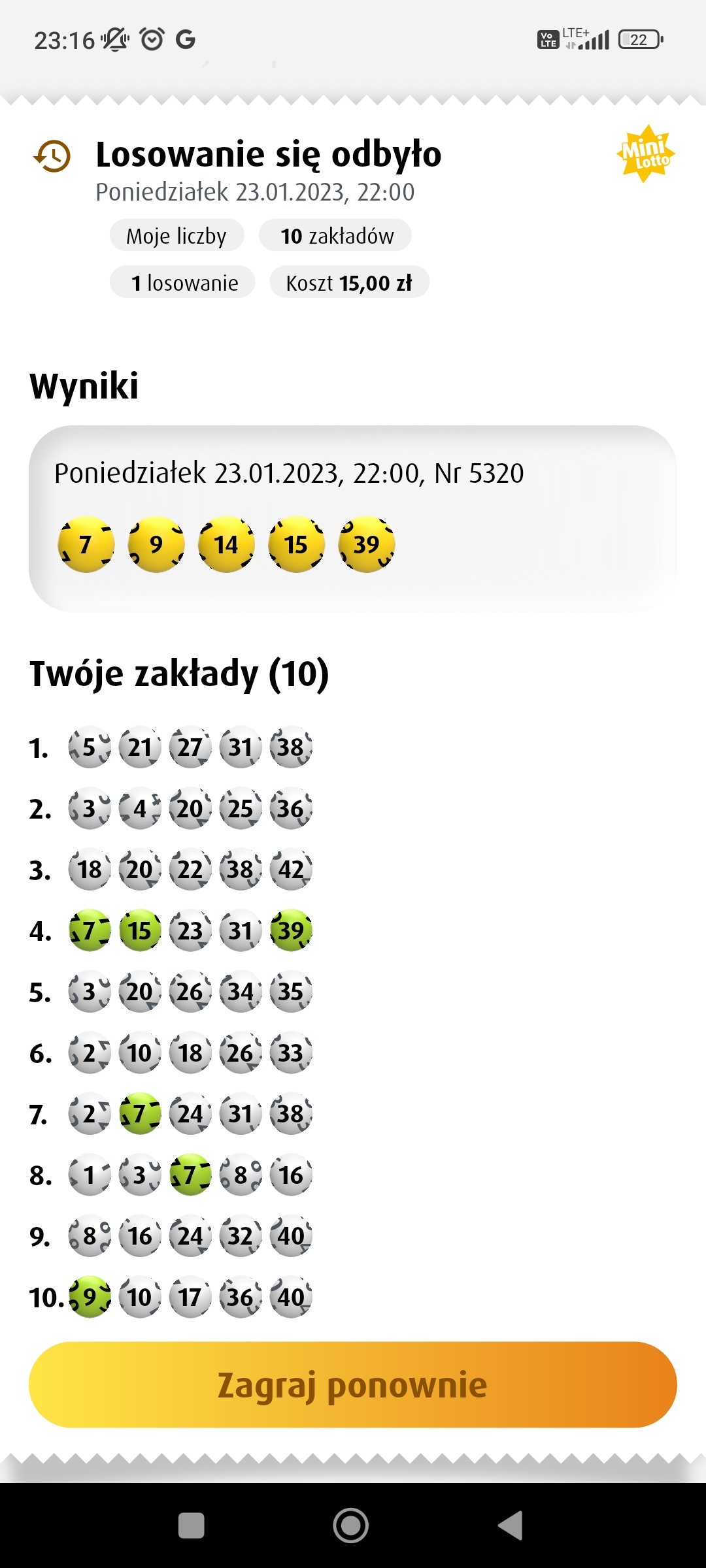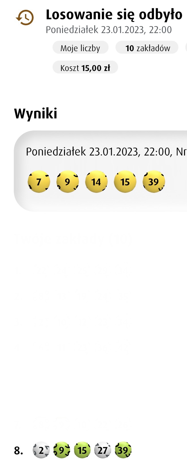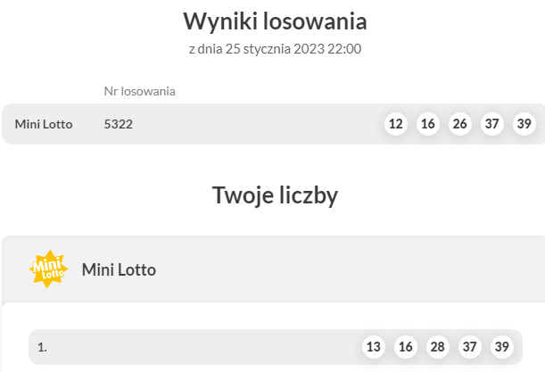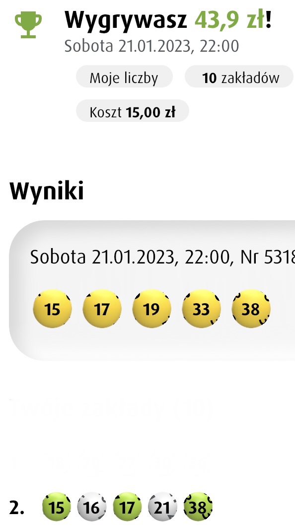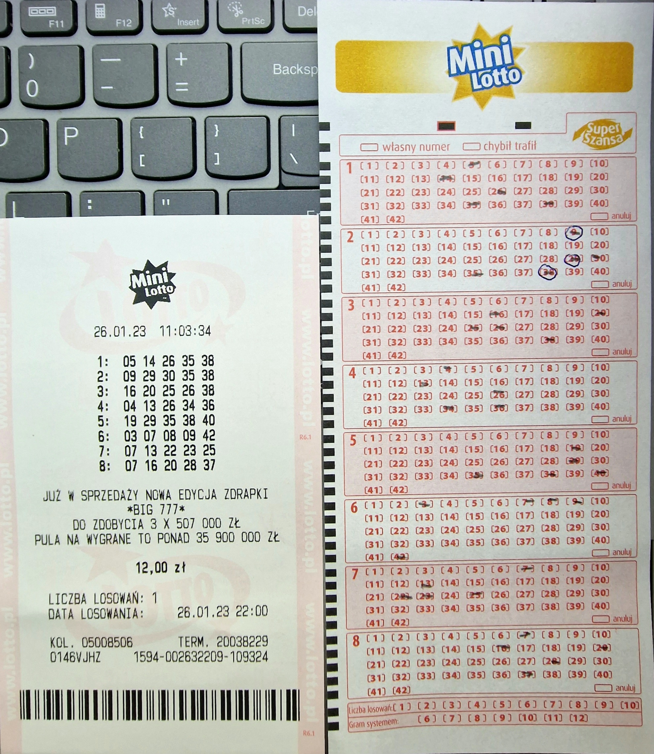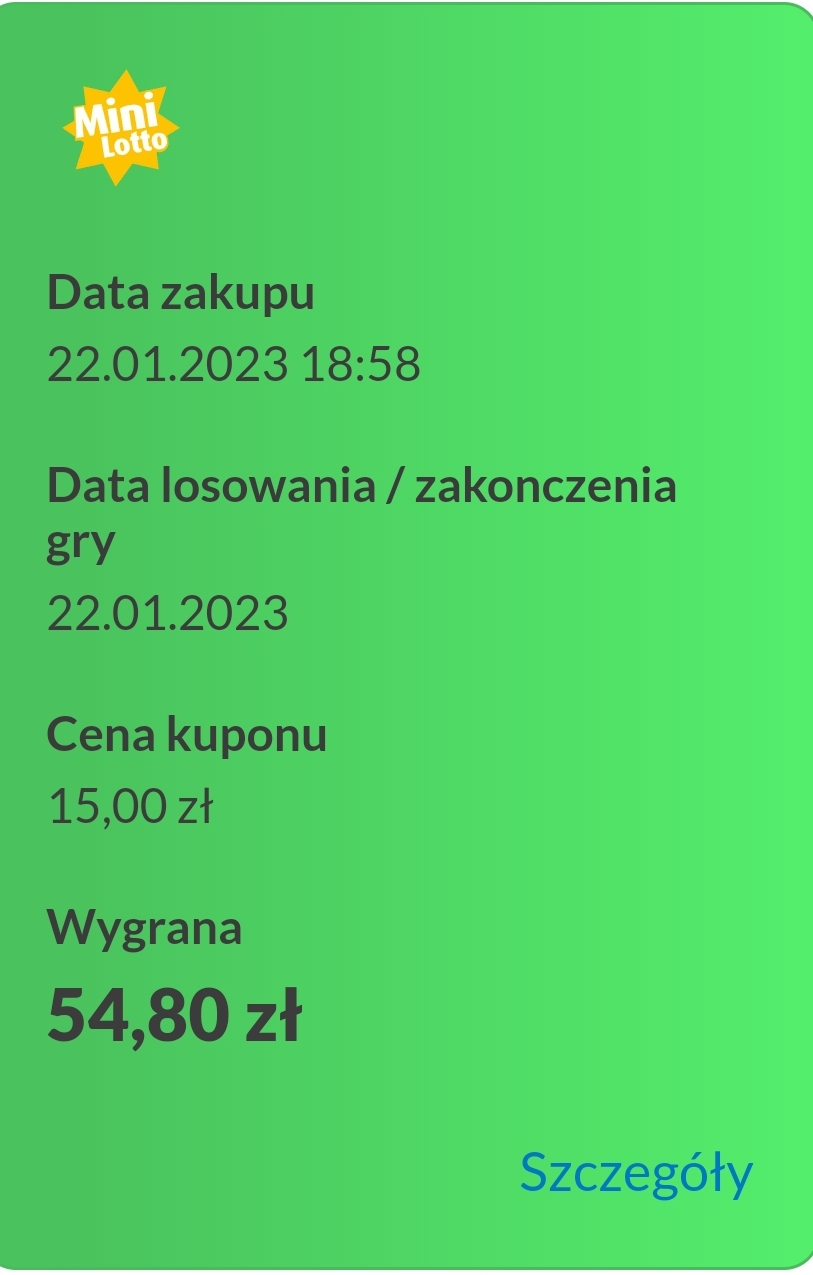 Moja pierwsza 3jka w Mini Lotto. W sumie poszło 10 zakladow i była jeszcze 2jka. Szkoda ,że mi tego dnia nie pyklo do 4ki ,bo było prawie 1700 pln ,ale i tak jestem zadowolony. Wysokich wygranych życzę.