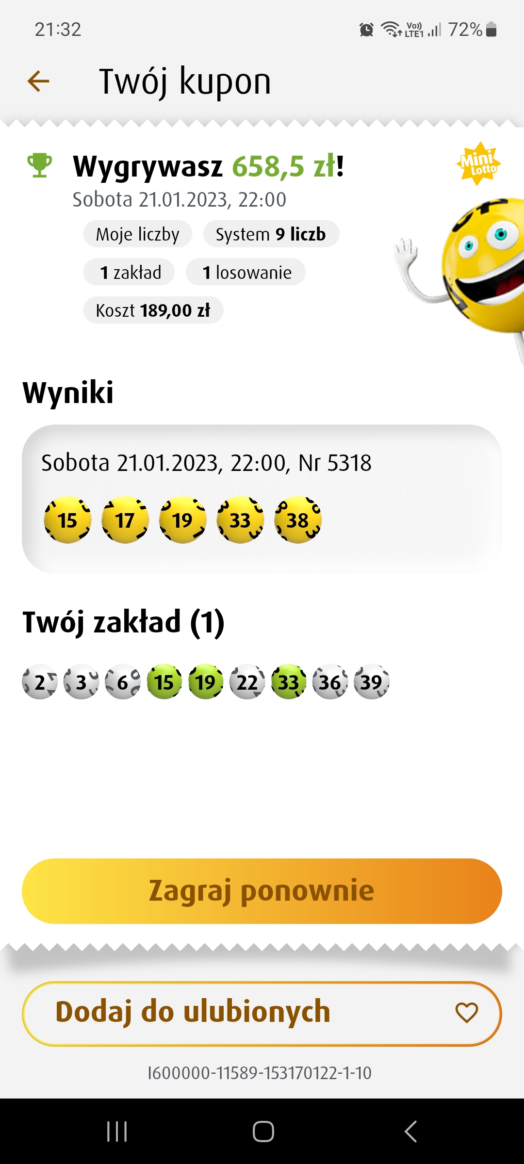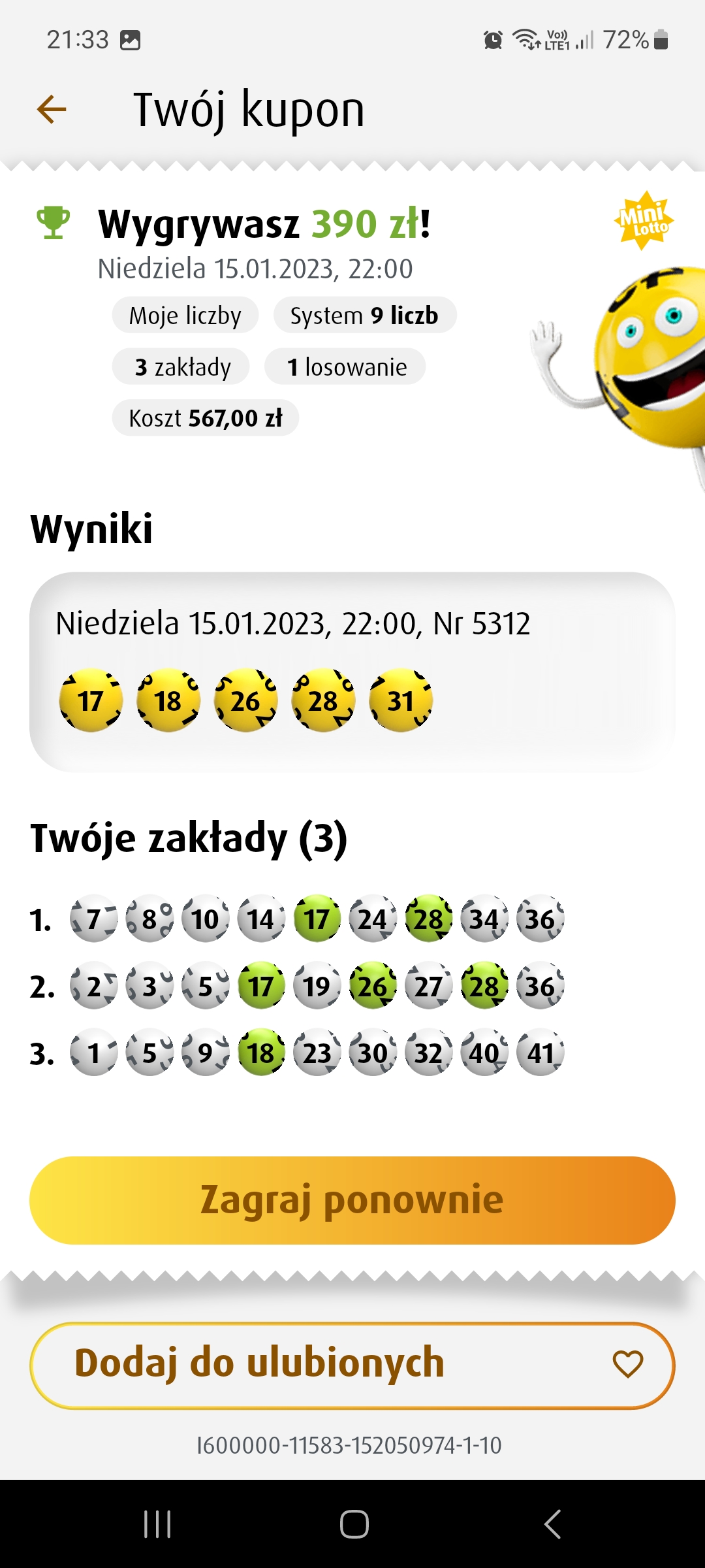 Ogólny zamysł miałem dobry - wykonania starczyło na "trójkę". Wysłane 4 zakłady, a wpadła w pierwszym. Kolejna trójka standardowa (24,60 zł) do kolekcji - tej podwyższonej chyba nigdy nie trafiłem albo góra raz