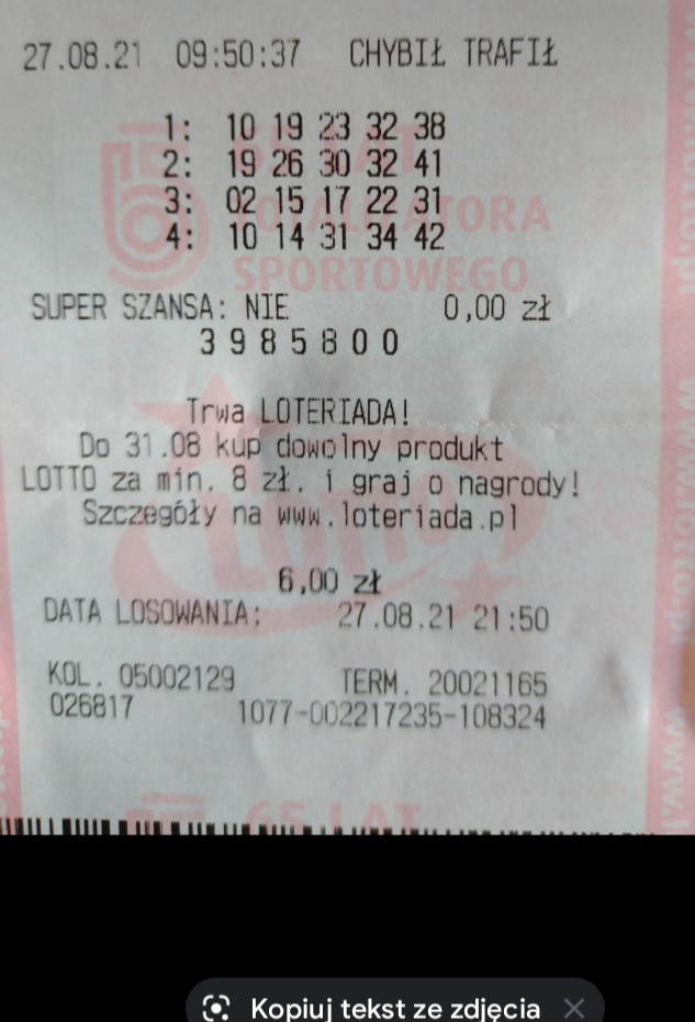 Ja wczoraj wysłałem 3 zakłady w tym 19,25,30,32,33. Heh, zamiast 26 dałem 25