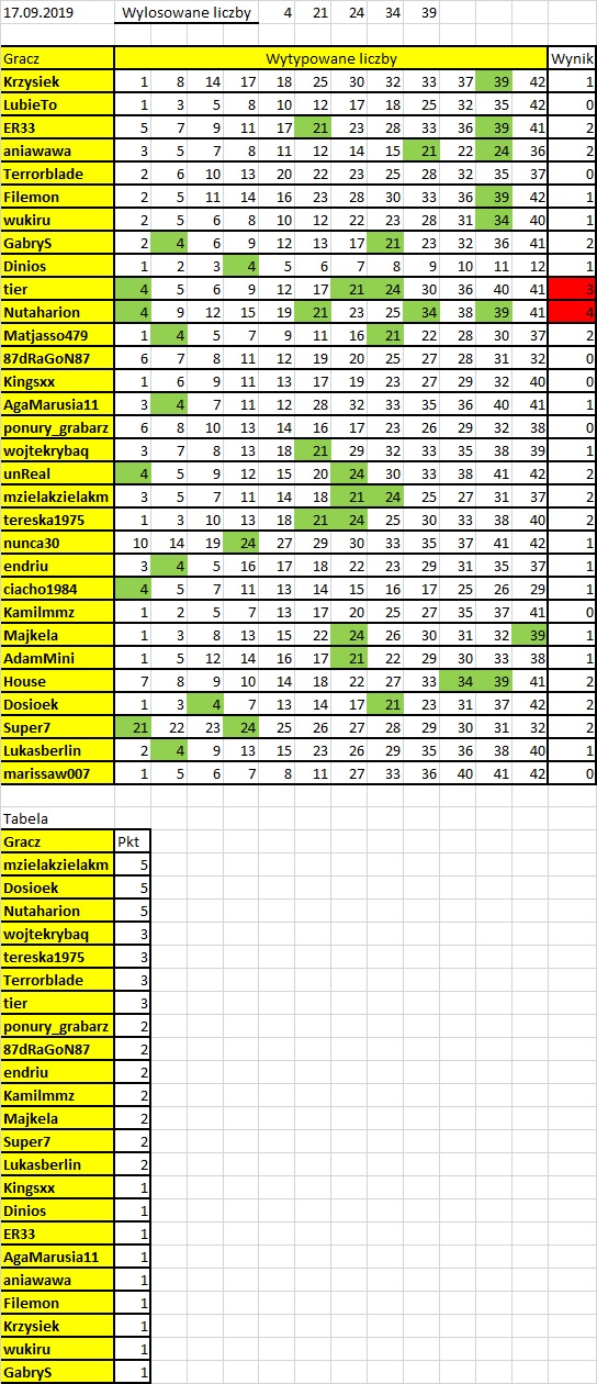 Zrobiłem dziś eksperyment puszczając 50 pojedynczych zakładów wykorzystując numery użytkowników z największą ilością trafień w tej naszej zabawie. Dam znać dziś po losowaniu jaki to przyniosło efekt