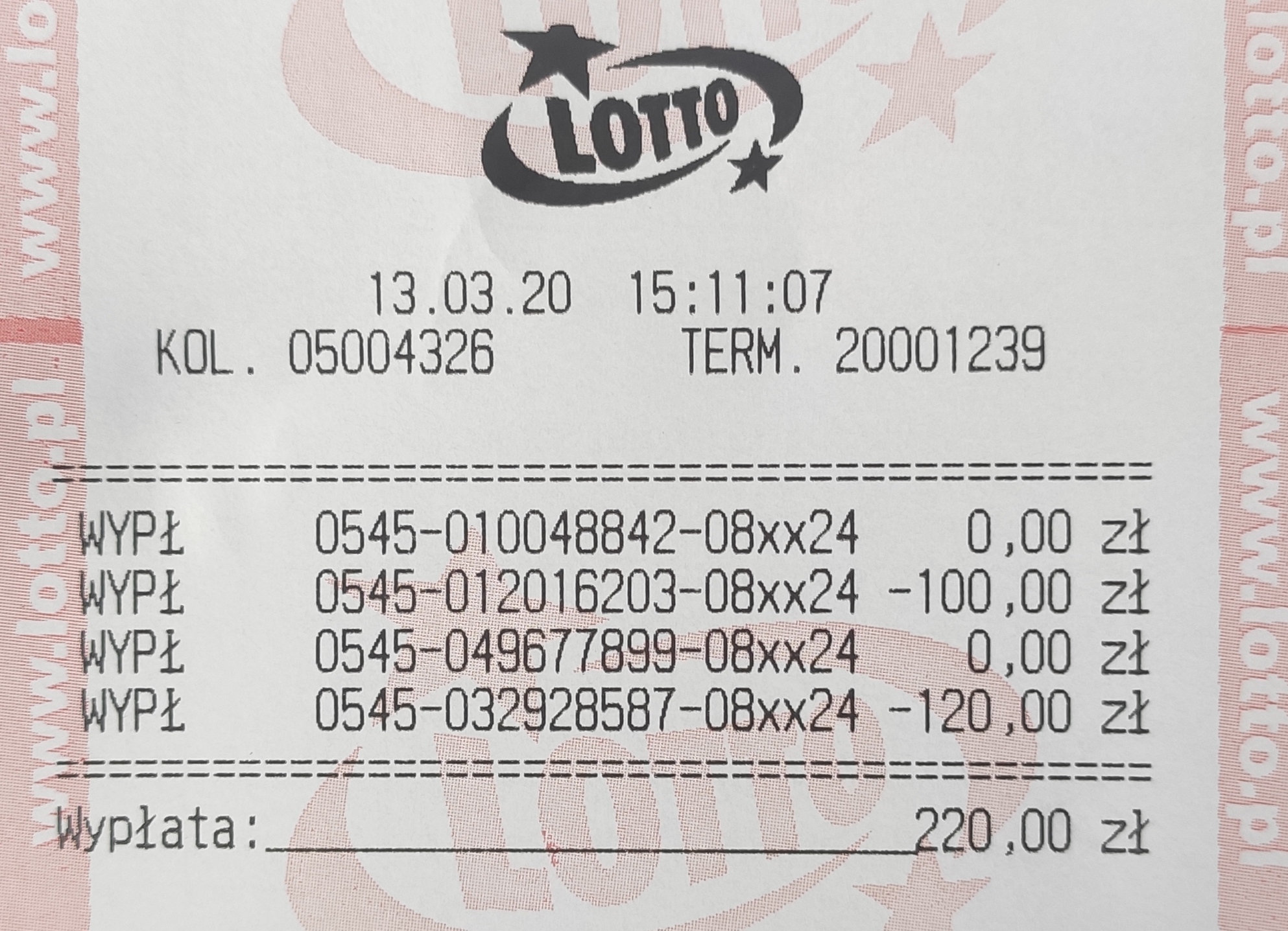 trafione 19, 23, 37 i 45. Gdybym zamiast 4 i 29 dał 20 i 33, miał bym milion, ale i tak jest ok, pierwsza wygrana trzycyfrowa w lotto