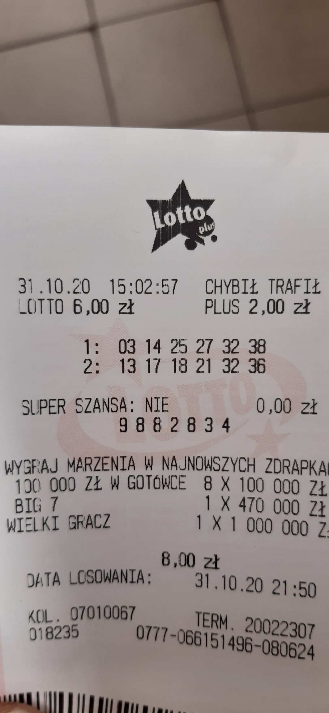 Mnie wpadła trójka na WT, ale tak naprawdę CT. Używam generatora liczb i przy większej ilości zakładów rotuję liczbami. Przykładowo, generuję sobie liczby i do wygenerowanych dodaję 2,3 lub każdą dowolną liczbę, potem w następny odejmuję itd. Często mi coś wpada, czasami mam nawet 6/6 tylko w zbiorze 5,6 i więcej zakładów.