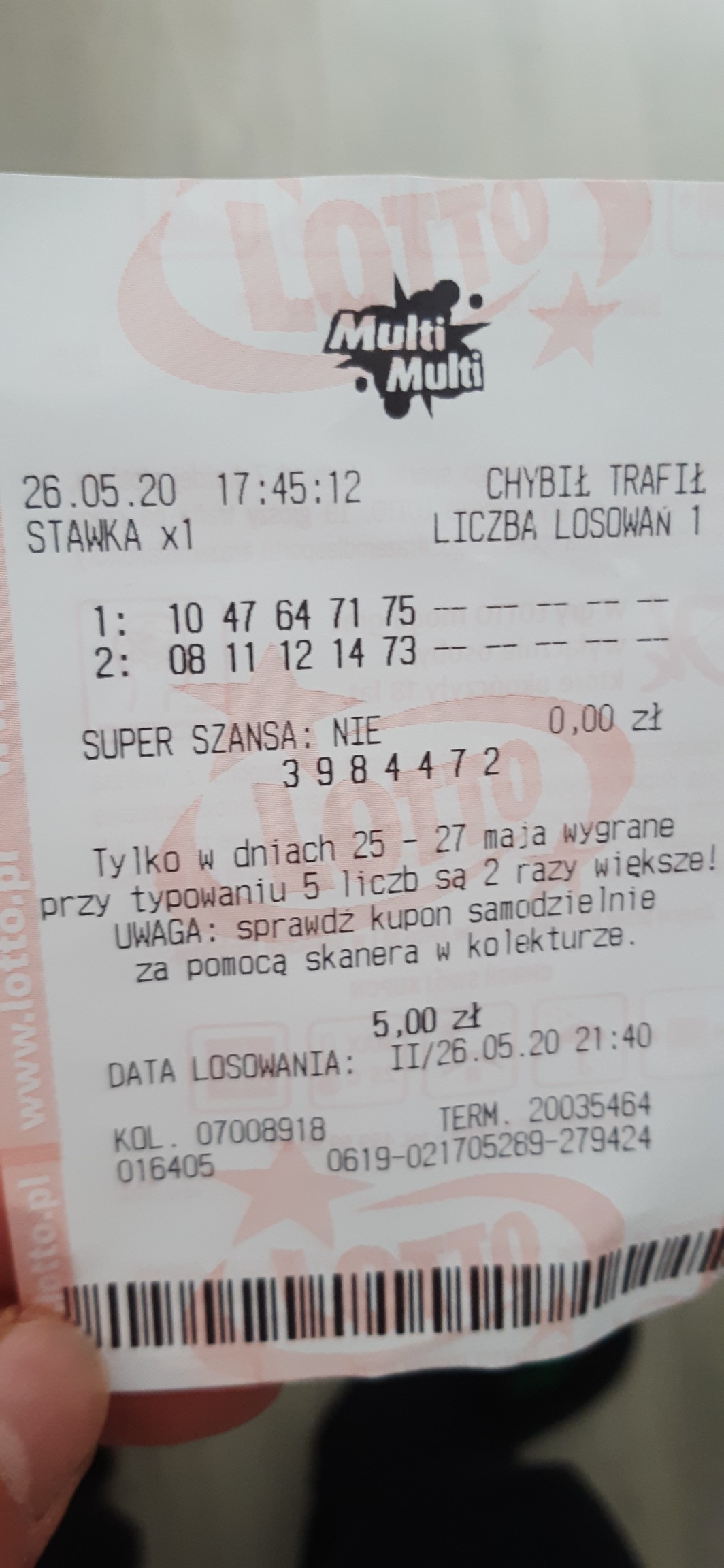 Mama posłała 4 zwykłe zakłady bez plusa na dwa losowania do wieczora za 20 zl i raptem 3/5 jedno weszło. Reszta oboki. Podziwiam bo musza mieć jakiś dobry spiskowy algorytm do wyliczenia że potrafią tak obsypać obokami. To teraz pomyślcie sobie ile tysięcy zakładów jest takimi obokami obsiane