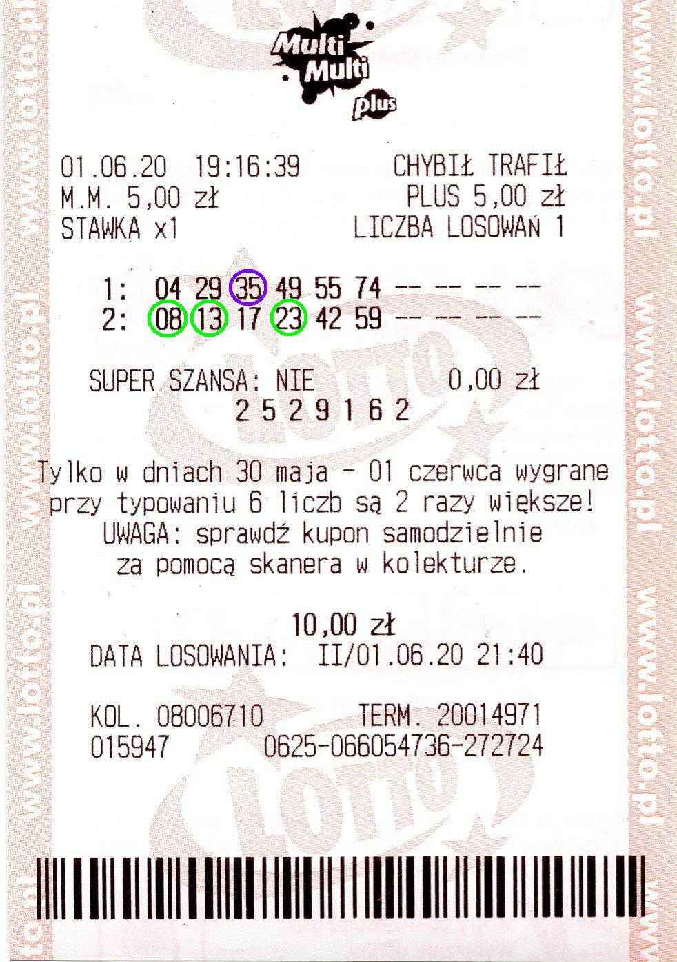 Wydaje mi sie że wiem skąd liczby brałeś do skreślenia bo obserwuje wszędzie liczby chyba że to przypadek. Zaglądałes może w statystyki mbnet w system na 4 trójki w multi ? Były tam trójki 1, 7, 37 oraz 29, 30,75 i widze u ciebie 6 takich liczb w jednym zakładzie razem. Masz tez na kuponie wplecione liczby 15,73, 76 które też widnieje na mbnet. Sorki za wscibstwo ale zawsze patrze na kupony innych i patrząc na liczby analizuję jaką metodą ktoś grał.Damian1309 pisze: ↑31 maja 2020, 22:2927789.0d5b1c4c7f720f698946c7f6ab08f687.jpg