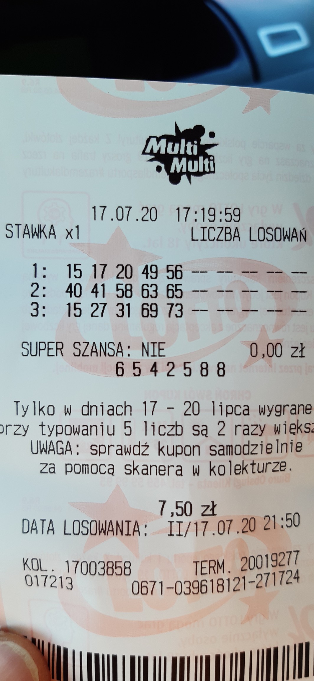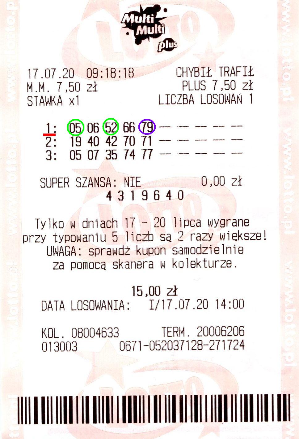 U mnie wczoraj na wieczór trochę dziwna wygrana 1/5 z plusem czyli trafiony tylko plus 28 zł