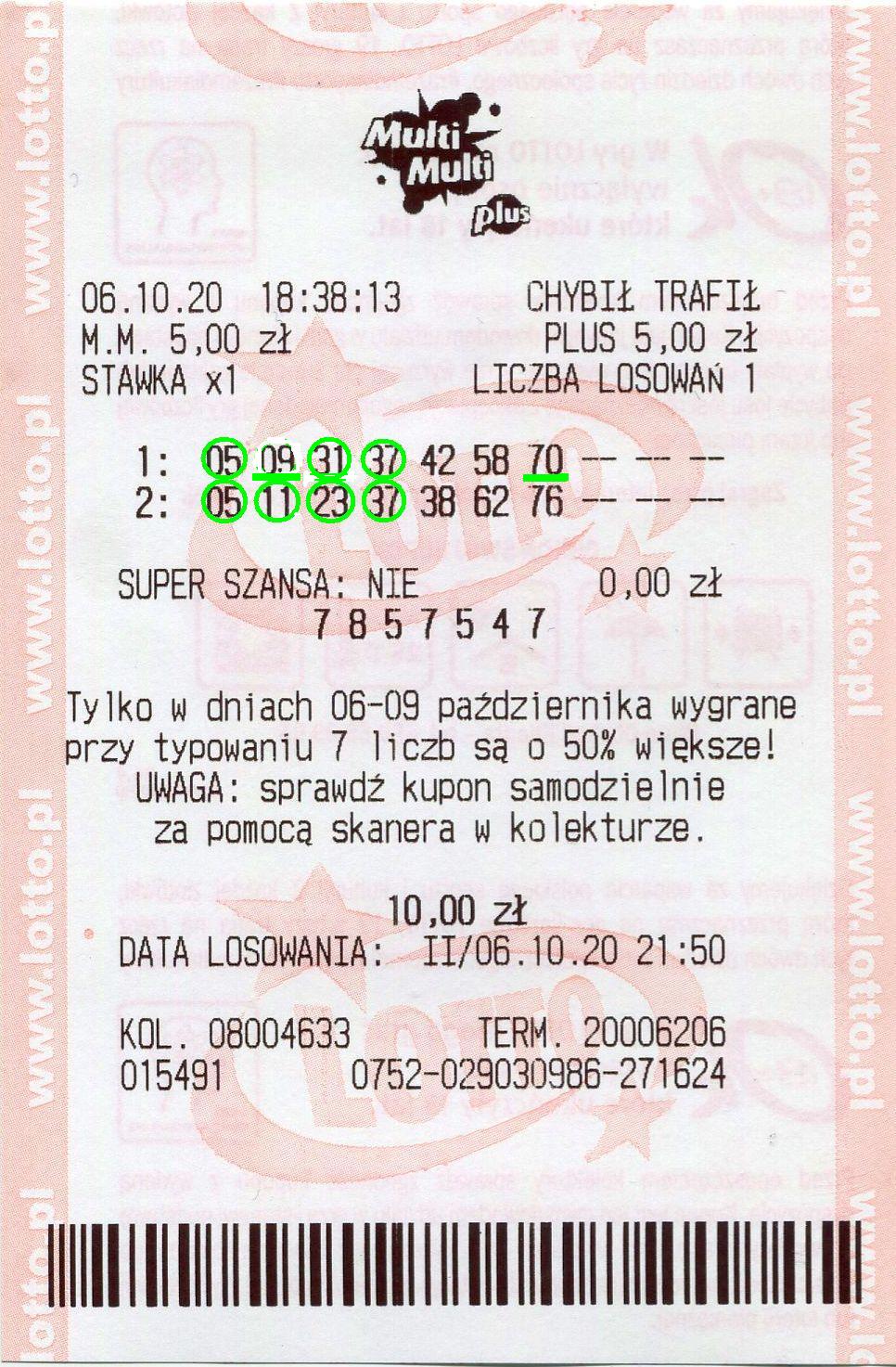 @Kamila, skreśliłem 4 zakłady, 2 na 5 i 2 na 7 skreśleń. Coś tam wcześniej analizowałem, poprzednie losowania