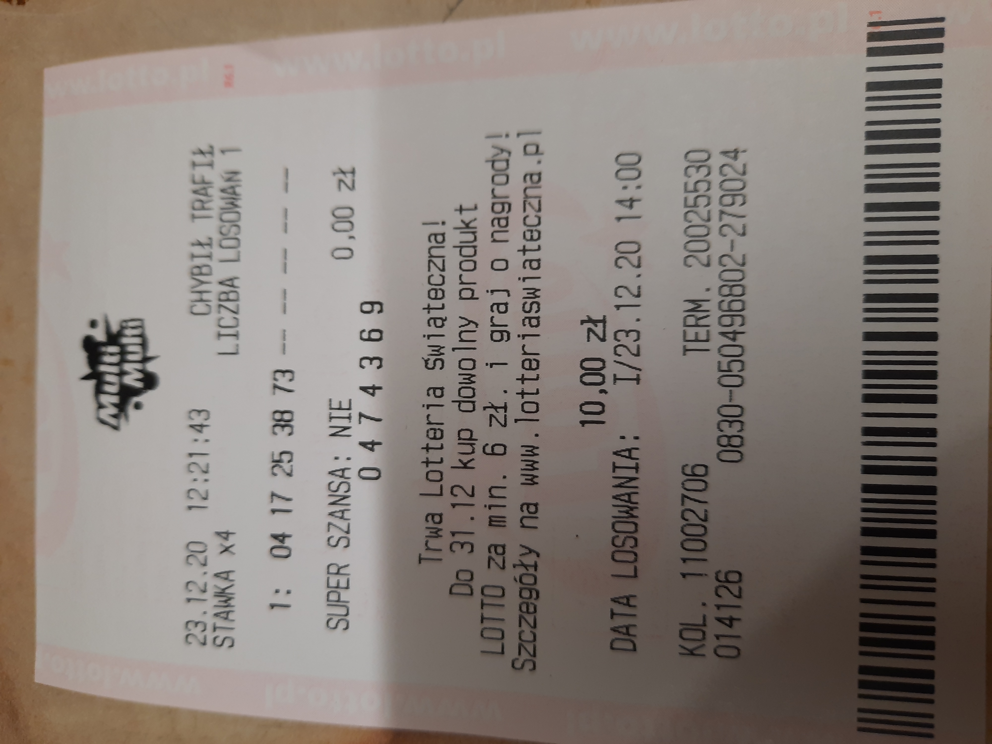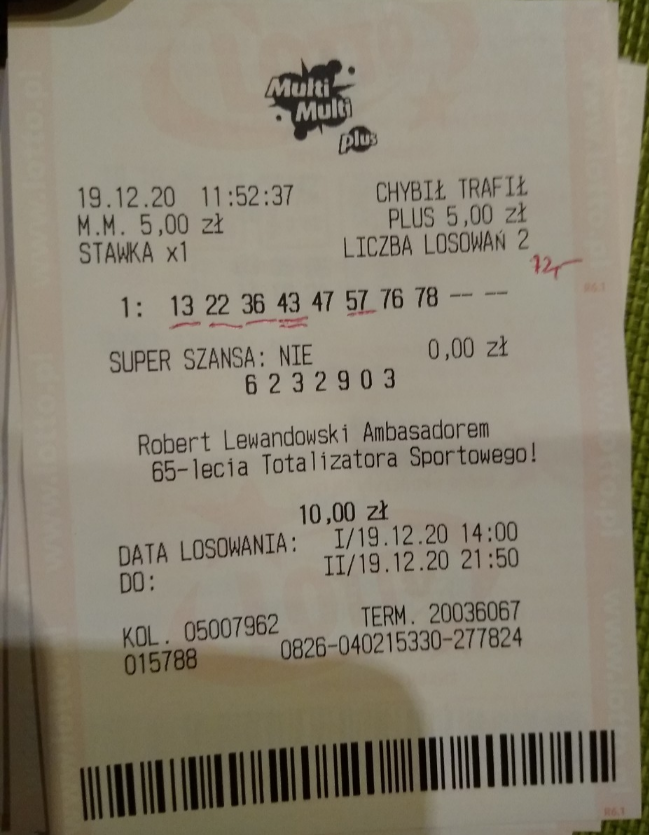 Jak na promo dobry start u mnie na 5/5, puszczony jeden zakład CT na 8 losowań i weszło z 14 tej 8 zł. Czyli połowa odegrana.