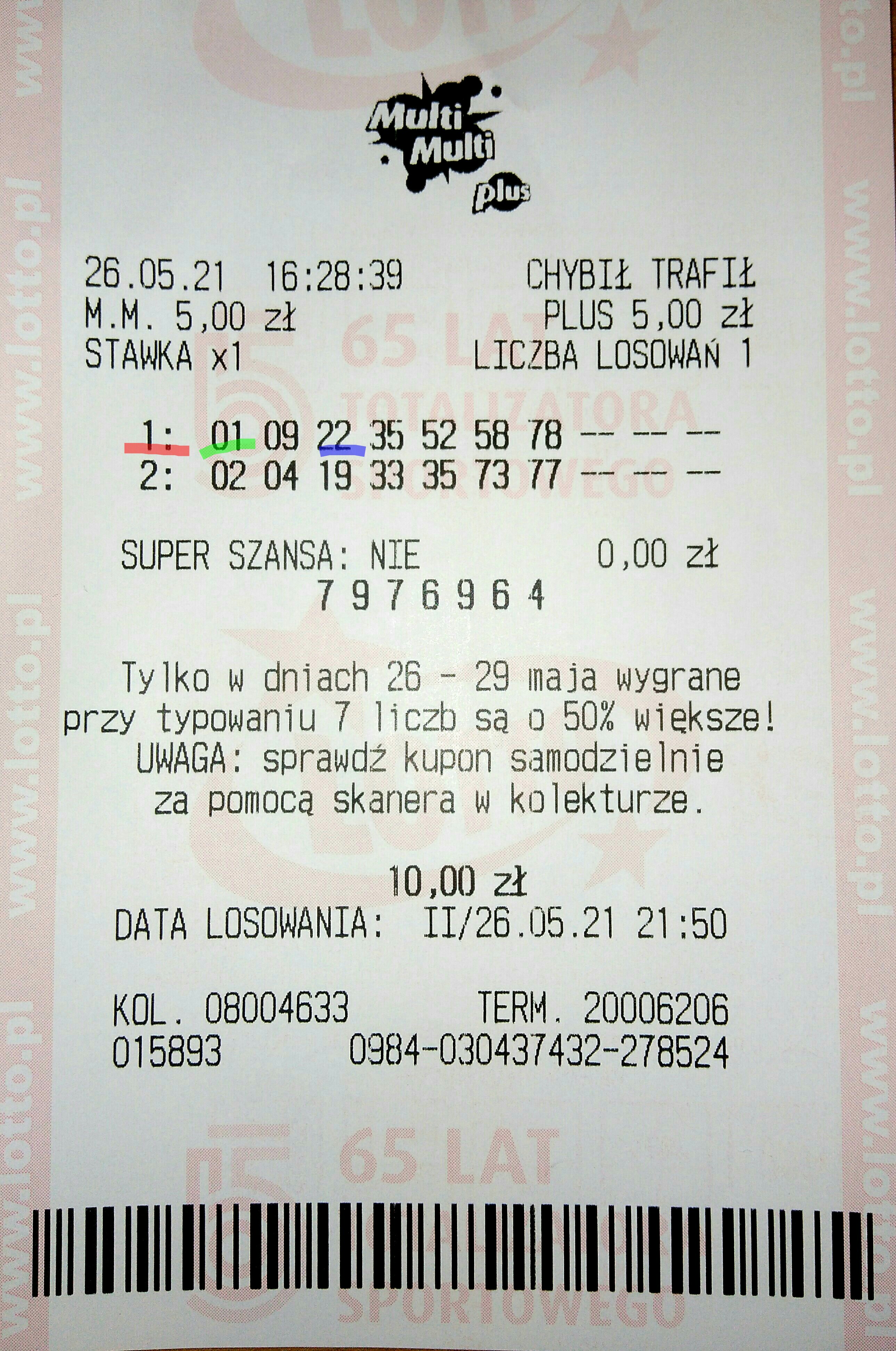 W maju gram swoimi dwoma numerami z plusem na dwa losowania i 3 razy udało mi się trafić 16 złotych, plusa jeszcze nie. Także mam jakieś 150 złotych w plecy. Teraz biorę też siódemkę promocyjną CT i miałam wczoraj 3 złote.