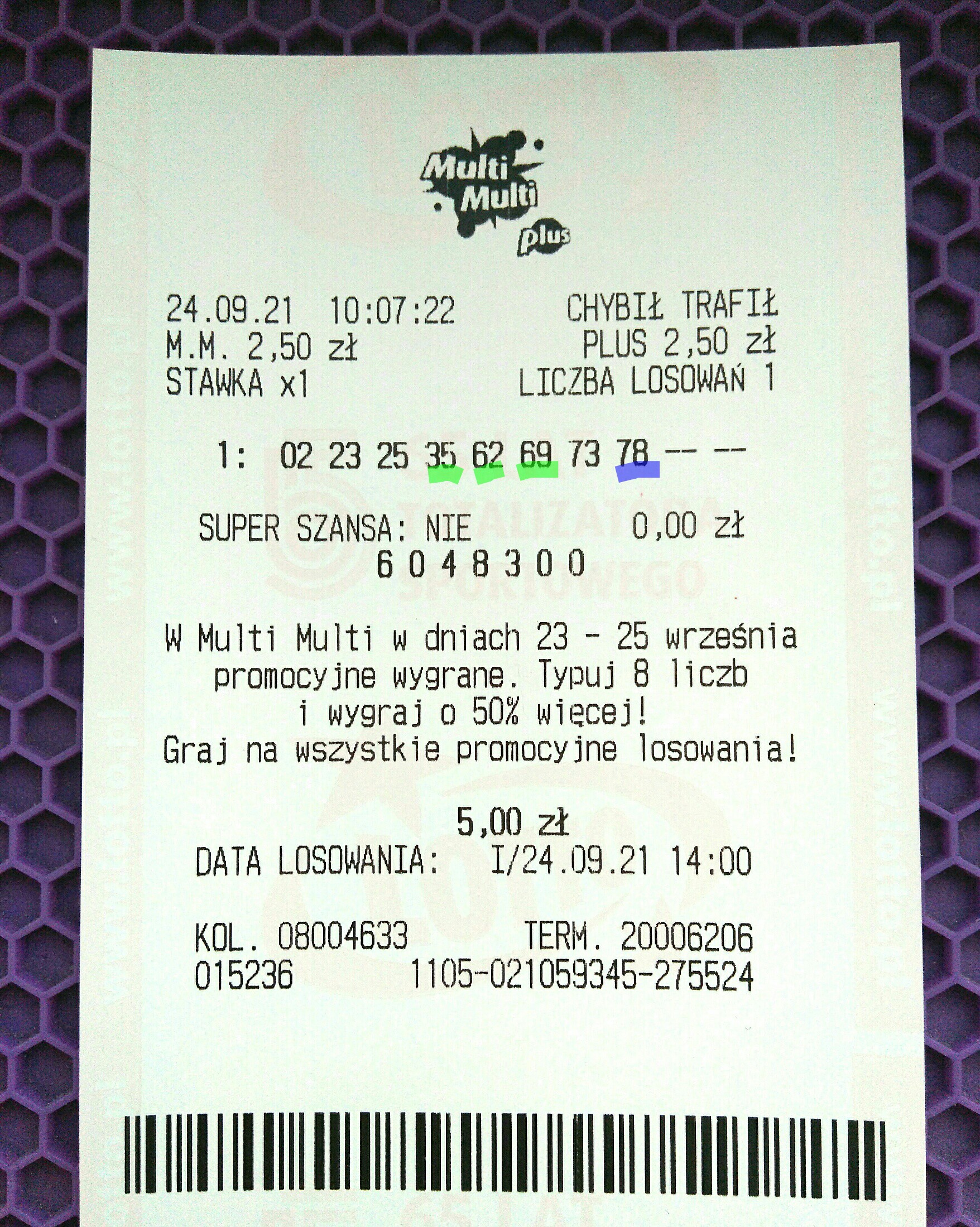 ja promocję rozumiem tak załóżmy że jest na 5 liczb 50% więcej to zamiast 700 zł wygram 1050 zł przy tragieniu 5/5 takNutaharion pisze: ↑23 wrz 2021, 8:30Gratulacje! Jak były promocje na 100% to czasem zdarzało mi się zagrać ale bez promocji bo można wtopić nieźle![]()