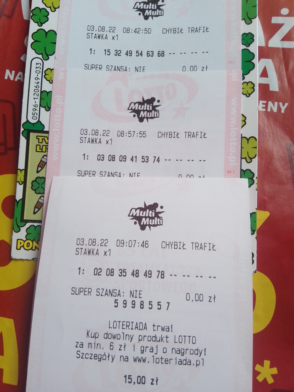 wczoraj wieczorem 3/7 przy dwóch zakładach CT, dziś o 14:00 3/7 przy dwóch zakładach WT, dam jeszcze znać wieczorem bo kupon na dwa losowania