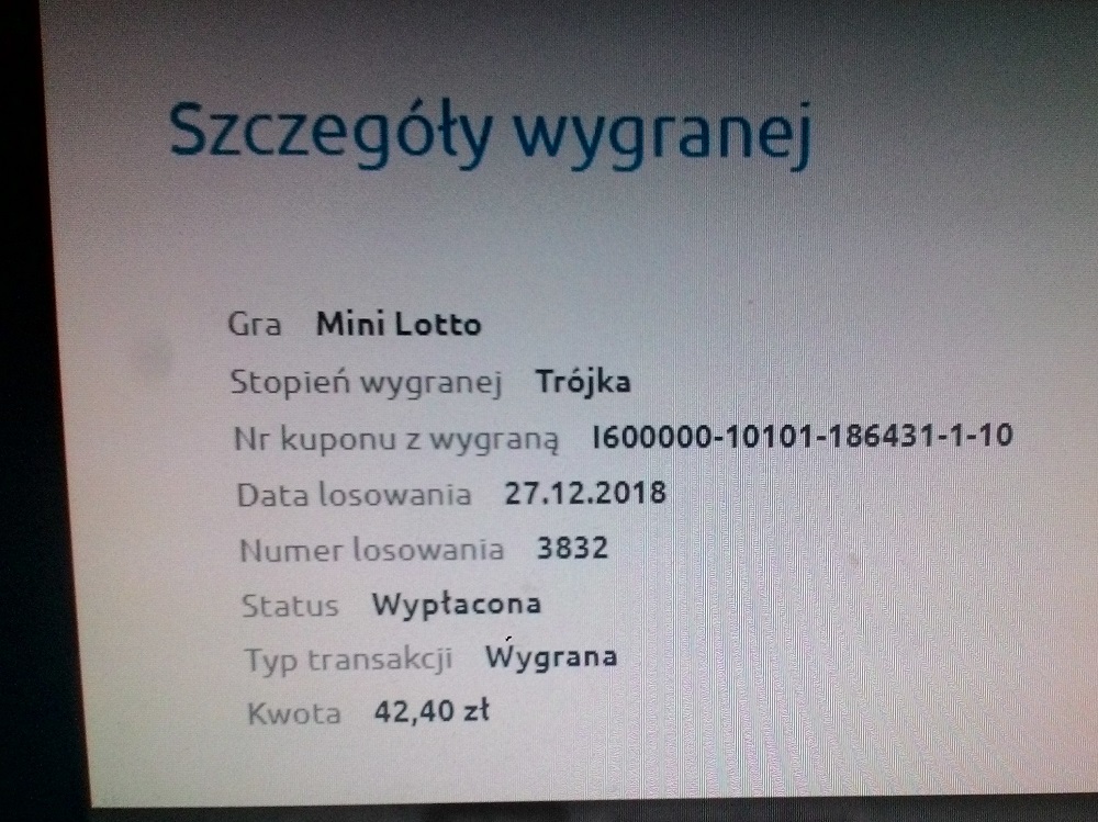 Gratulacjeponury_grabarz pisze: ↑28 gru 2018, 6:34Wpadła trójka , dobrze płatna ,przynajmniej coś się wróci 42,40 złponury_grabarz pisze: ↑26 gru 2018, 7:02W tej grze często niestety stawiam na ilość , od wczoraj 15 CT on line do niedzieli ( 6 losowań) 112.50 zł po 1 losowaniu 3 x 2/5.