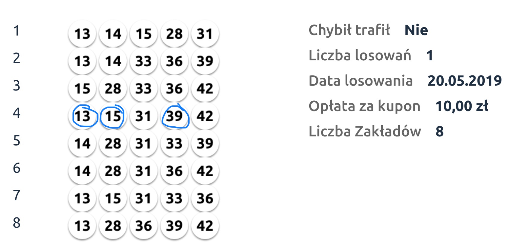 Ja gram codziennie po 10 zakładów na chybił trafił od kwietnia. W kwietniu 2 "3" płatne po niecałe 20 zeta. W maju już 3 "3" 2 słabo płatne i jedna 44,10.