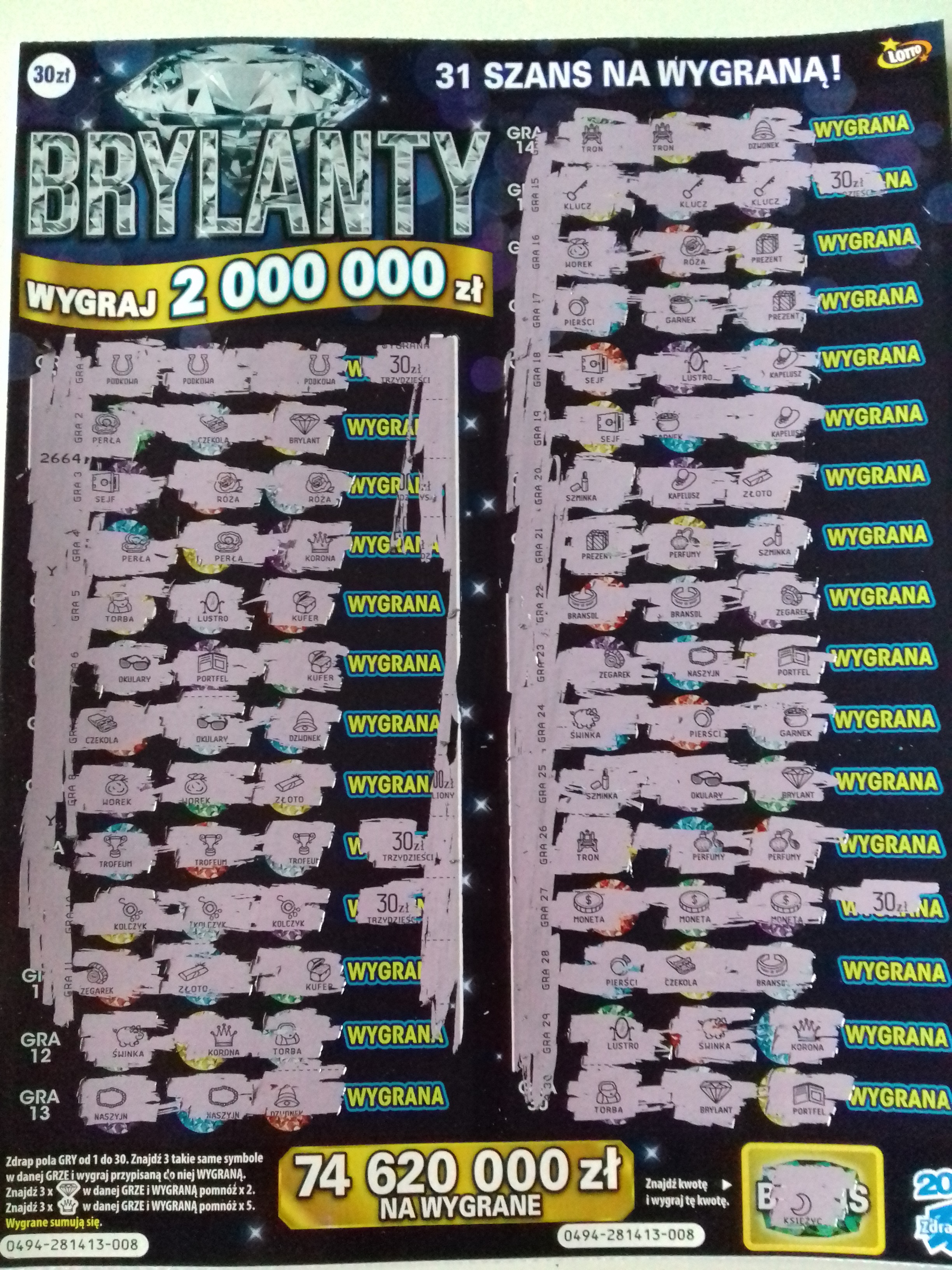 Dzięki Heh ja też się bałem, ale wyszło super. To są zdrapki i zauważyłem, że żadne magiczne myślenie tutaj nie pomaga. Jak byłem pewny jakieś zdrapki to wyciągałem puste a jak się bałem Brylantów bo w Wielkiej miałem 2x30zł i 1x 60zł na chyba 20 szt kupionych to bumMarzenkkaSzymuś pisze: ↑30 maja 2019, 9:13Gratki Michał ja też właśnie wybieram się ją kupić ale jakoś się wącham że wtopie haha