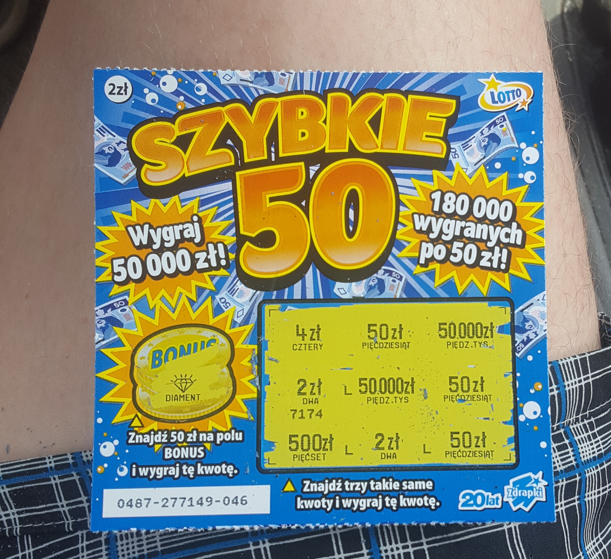 Ja wczoraj 4 sztuki i trzy puste, w jednej zwrot. Dziś wracałem zmęczony, ale zaszedłem do kolportera, tam często leżą zdrapki bo obok jest punkt-kolektura i większość kieruje się tam. Poprosiłem o 5 sztuk i na szczęście się udało, w końcu ! Zdjęcie daję, bo ta zdrapka zawsze mi średnio szła i jeszcze w żadnej edycji nic ponad 4 zł nie trafiłem. Co ciekawe jak sprzedawca wręczył mi 5 szt. zdrapki i spojrzałem na wczesne numery (od 04 do 08) to tak mi się skojarzyło ze zdjęć albo informacji z forum, że często 50 leży w numerku z przodu, a rzadko mam dostępny początek paczki. Także dziś 4 sztuki puste, a pod 006 jest trafione.