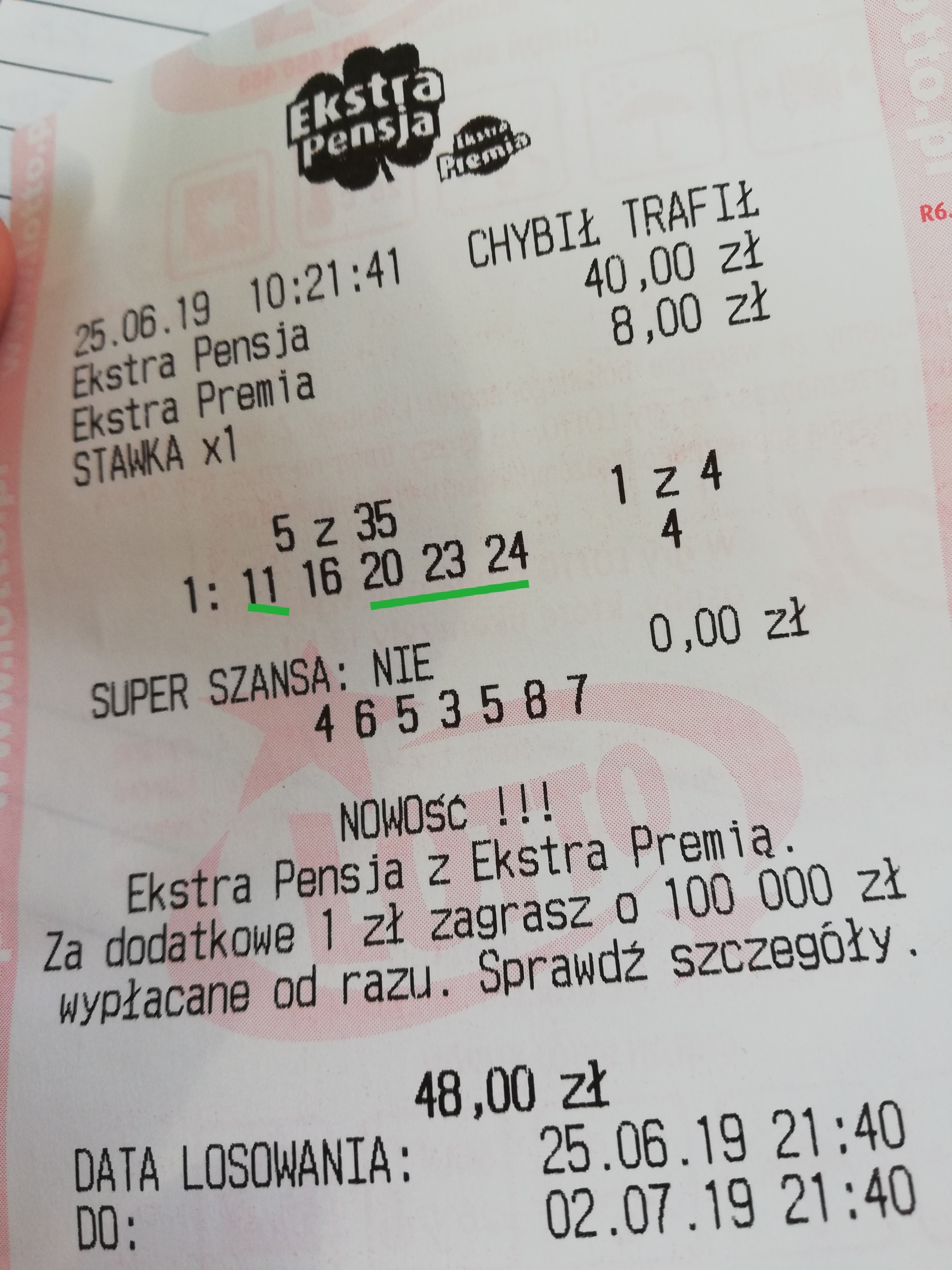 Ostatnio (17 - 24.06) kupiłem 1 zakład na 8 losowań z ekstra premią na CT, to na 48zł wydane, zwróciło się 43zł. Teraz zagrałem tak samo i jak widać opłacało się...